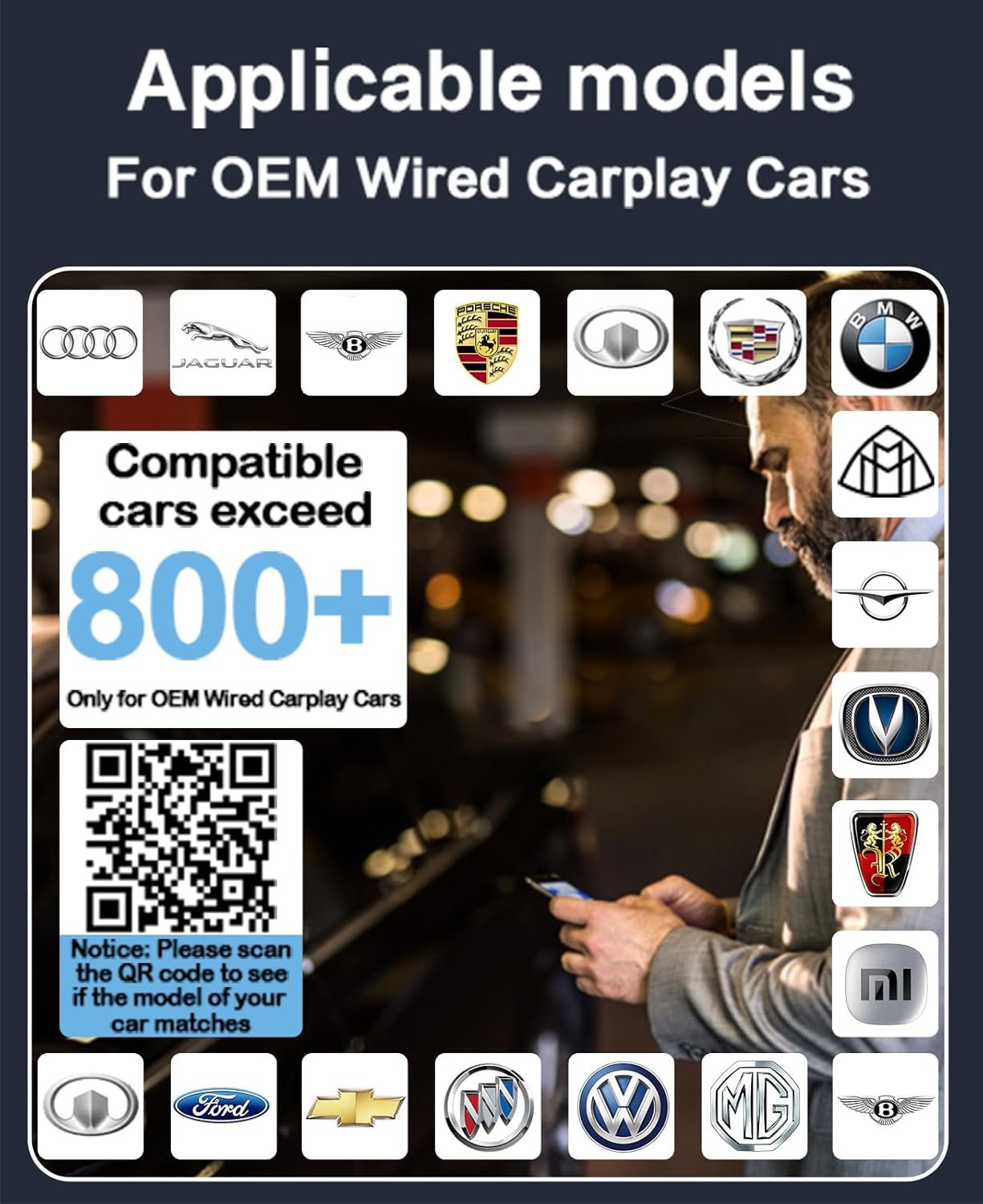 【User-friendly Plug and Play】Quick to start using the wireless Android Auto adaper with 3-step setup without additional apps or drivers. Once paired, it will auto reconnect to your device every time. Instant plug and play, fast auto-connect, online upgrades, sophisticated UI design, no more tangled cables, it totally reduces the damage of frequent plug and unplug the charging cable into your phone 【Android Auto Wireless Adapter】Easy to convert your OEM wired Android Auto to wireless! You could use full android auto function and keep the original car operation such as navigation, music playing, voice assistant, phone calls, radio etc. control everything with a word, Or a touch, Or a twist. This sleek and stylish android auto wireless adapter is the perfect companion for your vehicle! 【Universal Compatibility】Our Wireless android auto adapter support for Google, Samsung, Oneplus and other android phones & System android 11+ (not for iOS) and more than 800+ vehicles equipped with wired Android Auto. NOTE: Only for OEM wired android auto cars. (Plug it into the car, do not plug in your phone, our adapter will not consume battery on your phone) 【Extremely Efficient A7 Intelligent Chip】Buit-in A7 Chip With 5.8 GHZ WiFi, 5.3 Bluetooth and 8-core genius processor for Android Auto which makes data transmission rate by up 40%+, transfer Google Maps, media and messaging apps to your in-car display up to 10 times faster than others. Unique A7 chip keeps excellent performance in Anti-Oxidant, hardness, corrosion, and Temperature tests (-20°C to 70°C). No worry about disconnect during a long driving 【Premium After-Sales Service】Our Android Auto adapter customizable parameter settings, seamless version updates, and hassle-free issue reporting. Any problem, Worry-free 365 days warranty. Do solve your troubles within HOURS