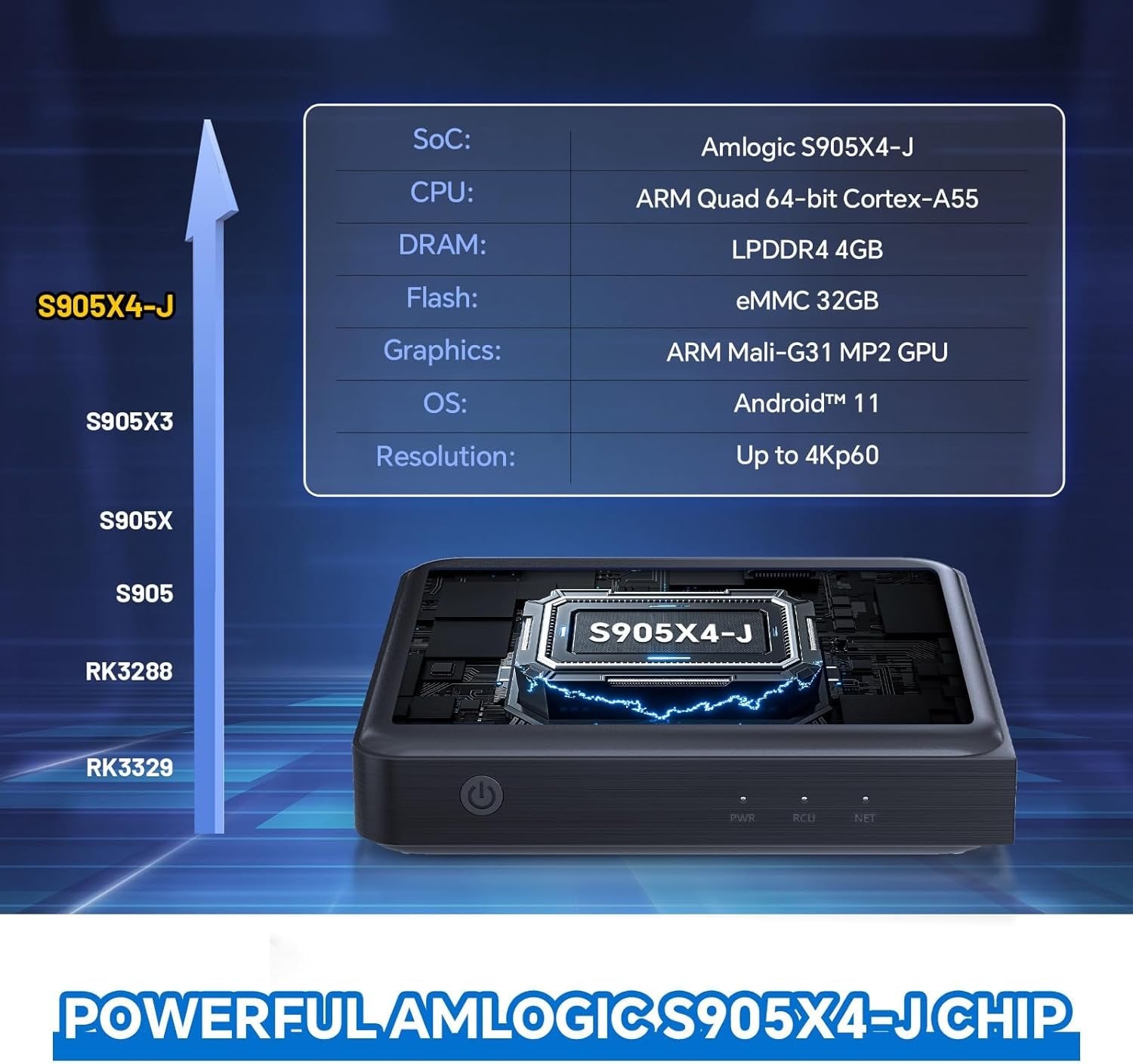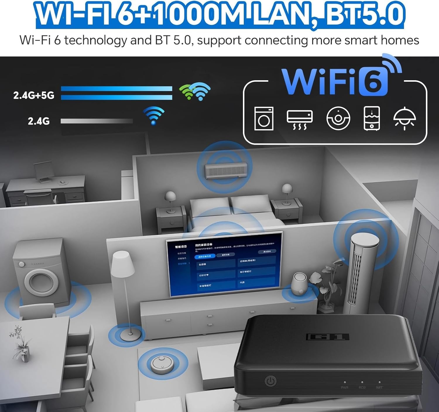 đșăGoogle Android TV 11.0 OSăïŒGoogle Certified TV box with Android 11.0 operation system equipped. With Google Official Authorization, users are able to download thousands of applications via Google Play Store, employ built-in Chromecast projection function, which provides a convenient way to cast the content from handsets to bigger screens and watch 4K content with HDR. đșăExcellent Amlogic S905X4-J ChipsetăïŒG1 utilizes the latest Amlogic S905X4-J Quad-core cortex-A55 CPU with Mali-G31 MP2 GPU, which ensures a higher stability and smoother performance of the TV box without buffer. Moreover, G1 has great storage capacity (high-quality 4GB DDR4 + 32GB eMMC ), providing enough space for users to rapidly download various kinds of apps and games. đșăWi-Fi 6+10/100M LANăïŒG1 built-in 2.4G/5G Dual WiFi and RJ45 Ethernet, provide convenient connection and more stable WIFI signal to enjoy smooth video playing, no worry about freezing and buffering. Just plug in the power supply, connect the HD cable and wifi/ Ethernet LAN, you can watch whatever you like. đșă4K Streaming TV Boxă:G1 supports 4K Dolby Vision HDR streaming (Dolby Vision / HDR10 / HDR10+ / HLG), with professional HDR10 media profile and H.265 video decoding technology, ensuring an ultra-high-definition and realistic feast for eyes. đșăVoice Controlă: The TV box built-in Google Assistant is at your command. See photos, live camera feeds, weather, sports scores, and more on the big screen. Dim the lights and immerse yourself in your favorite show or music using your voice.