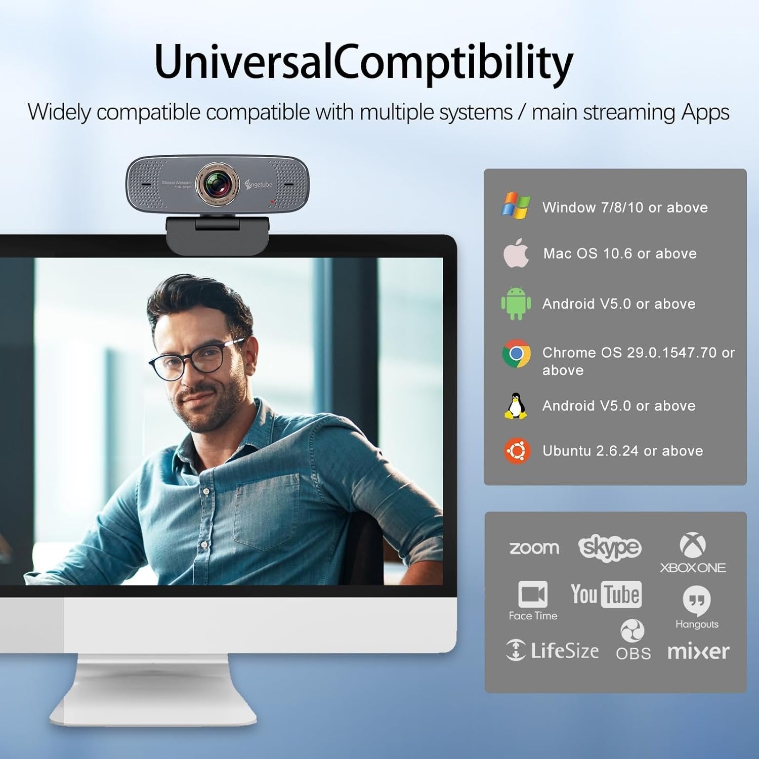 Streaming live webcam for video calling and recording.High light Features:1. With MJPG, YUY2 Video compression, it performs smoother transfer of videos.2.Facial-enhancement Technology Automatically image optimization makes you look more beautiful in the video.3.Adjustable viewing angle, The camera rotates not only 360 degrees left and right, but also 90 degrees up and down.You can easily adjust the shooting angle you need without shaking4.Working with OBS, it Supports live video on Facebook, youTube,Twitch,Smashcast,Mixer.com, Daily Motion, Restream.io, LiveEdu.tv. Share your gaming, art and entertainment with the world now!5.Full HD1080P 30 frames per second provides delicate video quality.6.Plug and play, easily connect to a PC, Mac or USB-enabled host without any software required.7.Video resolution: FULL HD 1920x1080,1280x720,640x480, etc.Operating system:Compatible with PC: Windows 7 | 8 | 10 or higher version - Mac OS 10.6 or higher version - Google Chrome OS - Linux.What’s In The Box:HD Webcam*1User manual*1Lens cloth*1 ã€Full HD 1080P Webcam with Privacy Cover】The camera for computer has a built-in 1080P Full HD 2 Megapixel CMOS and 6-layer premium optics with 1920 x 1080 resolution that captures ultra-sharp images at 30fps and delivers smooth videos. Enabling this computer camera to capture exceptionally pure and clear video quality. The webcam comes with a privacy cover to protect your digital privacy. ã€Low light correction and manual focus webcam】 this web camera is equipped with automatic white balance and low light correction to ensure that your video is excellent no matter what the lighting conditions are. You can adjust the focus ring for different distances between you and your computer until the image is clear. ã€90 degree wide angle lens】The 90° ultra-wide angle lens under the PC webcam accommodates more attendees.The 827 usb camera has 2 built-in noise-canceling microphones to improve the sound quality of live video or online calls, filtering out ambient noise and optimizing the call for a better experience and wider sound pickup. The webcam for pc is perfect for small to medium sized meetings for the best video experience. ã€Plug and play】set up your hd webcam right out of the box, no need to download or install any software, the smart system will automatically read the hardware drivers in seconds. This 1080p webcam is easy to operate. ã€Wide Compatibility】The laptop webcam is compatible with Windows 7/10/11, macOS 10.10 or later, Linux. This streaming webcam has wide compatibility with major software like Zoom, Facetime, Google Meet, Skype, YouTube and more. This usb webcam is ideal for online education, home office, meetings or video calls.