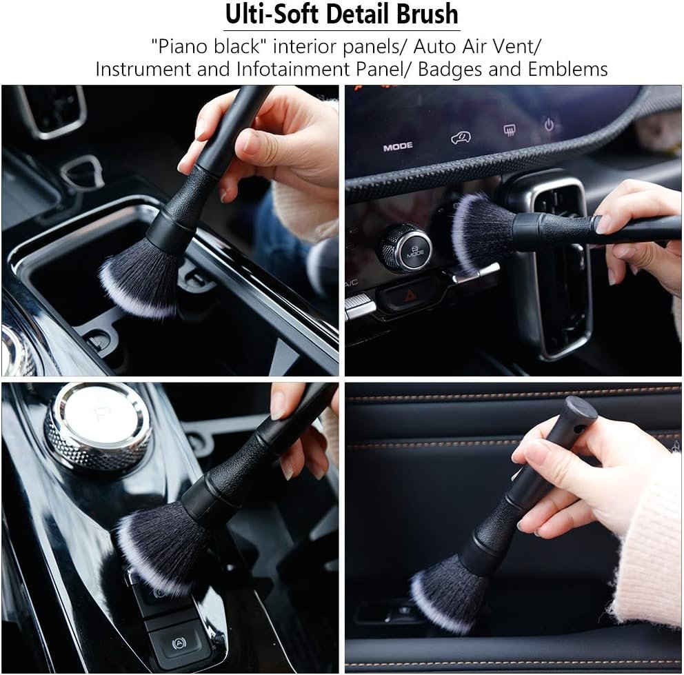 PREFECT DETAILING BRUSH SET FOR VEHICLES - The two ultra- soft brush for cleaning exquisite surfaces like dashboard, center console, screen, cleaning air vents, genuine leather seats etc. The blue bristle engine brush is suitable for stubborn dirt cleaning both car interior and exterior, such as scuff plate, lug nuts, wheel, tire, engine bay cleaning, long enough for lug nuts, narrow or tight space. PERFECT PRESENT- It is not only an auto detailing kit, but also professional motorcycle,RVs & Boats, home detail cleaning tool, best for precious furniture with piano lacquer. The car detailing brushes kit features with upgraded synthetic bristles, so smooth and gentle, very suitable for new car/ house present. FOR PET OWNERS- Use electrostatic adsorption method remove pet hair, dust, labour saving and protective for the scratch-prone surface, leather seats. BRUSH SIZES - 6.37’’, 9.64’’, 10.03’’ About AntBooBoo- Rooted in the automotive industry for 12 years,AntBooBoo has gathered many premium suppliers. We value product quality as well as customer. Any question, do not hesitate contacting us! Your messages will reply within 24 hours. .