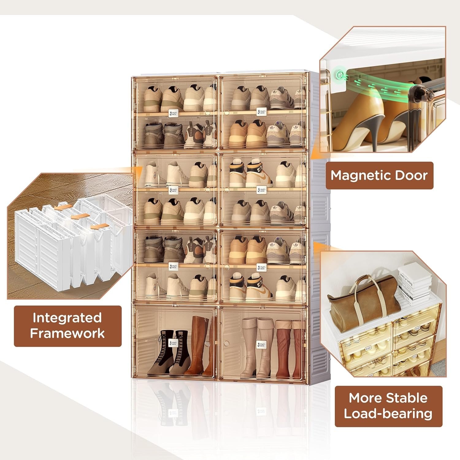 3-Minute Quick Installation: The one-piece folding design allows for easy setup and quick folding. Set up and fold in minutes with no tools required. Its space-saving foldable design is perfect for seasonal changes or prepping for a move Sleek & Contemporary Look: The minimalist design enhances your home decor, bringing both elegance and practicality to your space, while providing efficient storage. The collapsible structure adapts to your evolving space needs without taking up valuable room Durable & Reliable Build: Crafted with thickened PP panels and reinforced corners, this unit supports up to 130lbs. The sturdy frame ensures stability, even under heavy loads like shoes or books Fits Most Men’s & Women’s Shoes: Suitable for men’s sizes up to US 11 and women’s up to US 12. Fit may vary based on shoe width and height. Bulkier shoes may require angled placement. Please refer to the image with product length&wipth for helping determine fit more accurately
