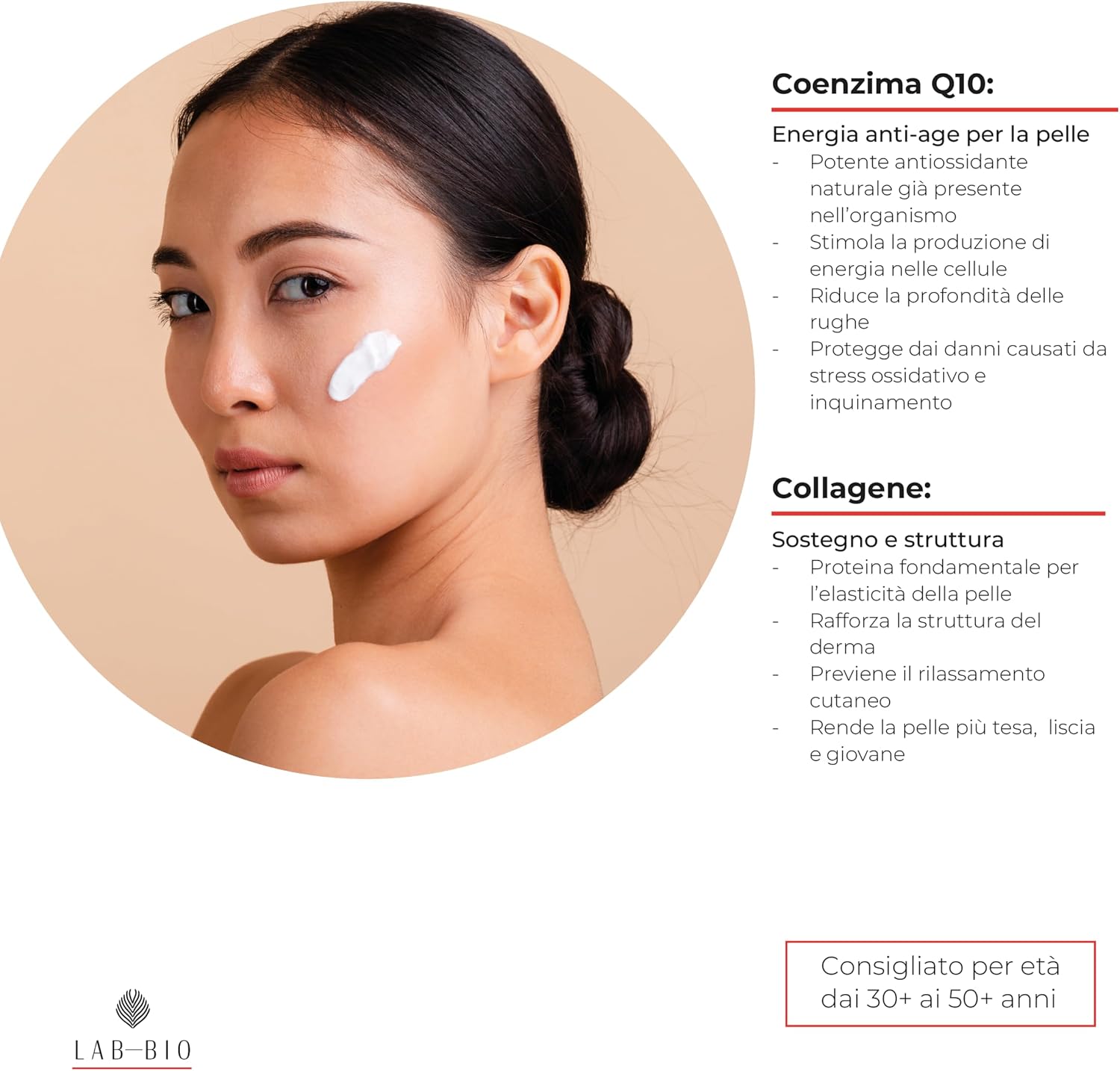 With COENZYME Q10 – Powerful anti-oxidant Coenzyme Q10 fights skin aging thanks to its antioxidant action: reduces lipid and protein peroxidation, counteracting wrinkles and loss of firmness COLLAGEN FOR ELASTICITY AND FABRIC TONE: Collagen helps to strengthen the structure of the skin, improving elasticity and firmness. Gives a visible firming effect on the face, neck and décolleté. Wheat germ oil – For sensitive and sensitive skin Rich in vitamin E, it deeply nourishes even the most sensitive skin. Promotes skin well-being, protects against free radicals and improves skin texture. Multi-function use: face, eye and neck contour. It can also be applied to delicate areas such as the eye and neck, to combat skin sagging and signs of ptosis. Ideal as a targeted firming treatment. RICH BUT LIGHT FORMULA - MEN AND WOMAN Nourishing texture but not greasy, absorbs easily and leaves skin smooth and velvety. Suitable for daily use for men and women, also as a day or night cream.