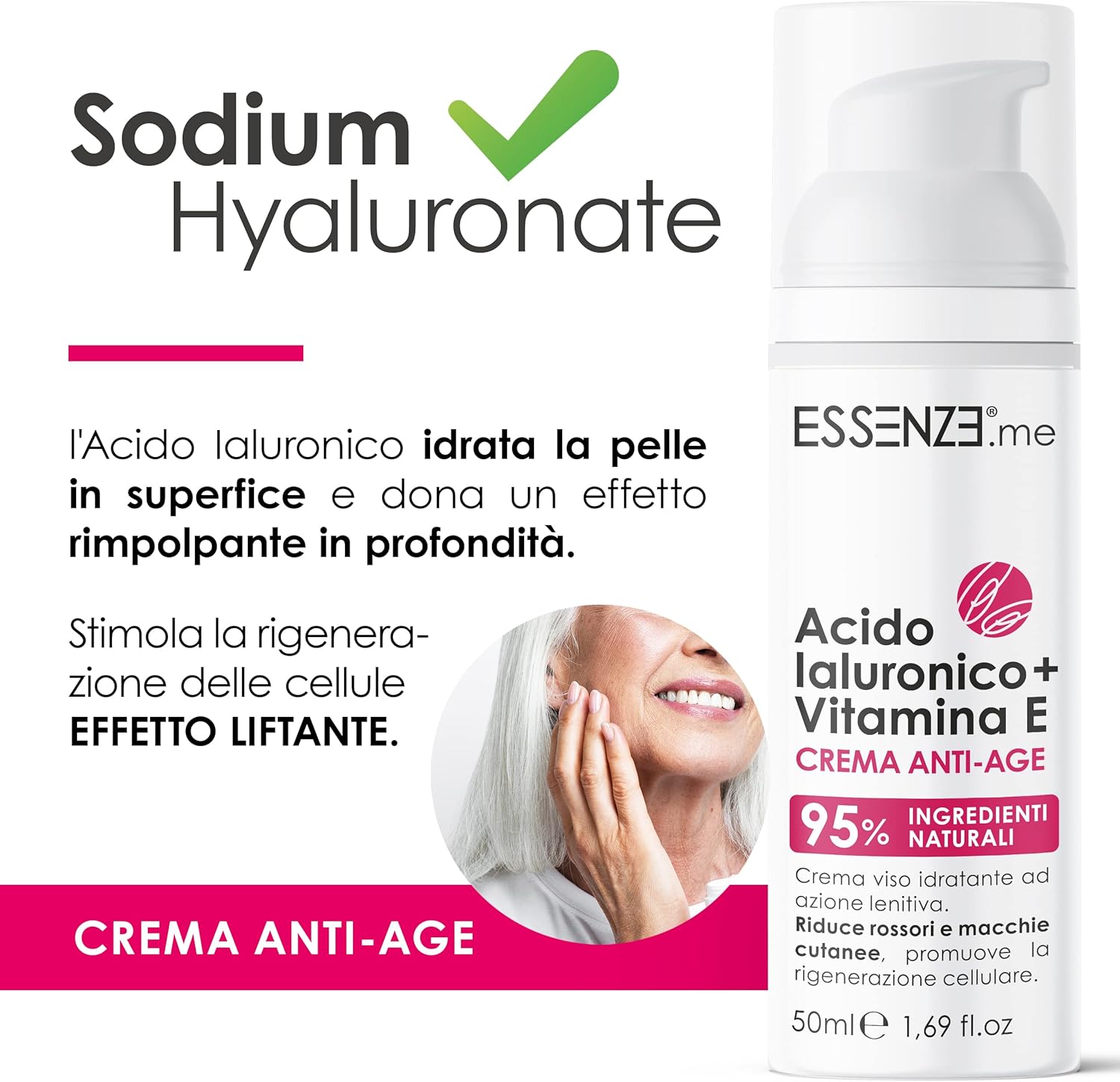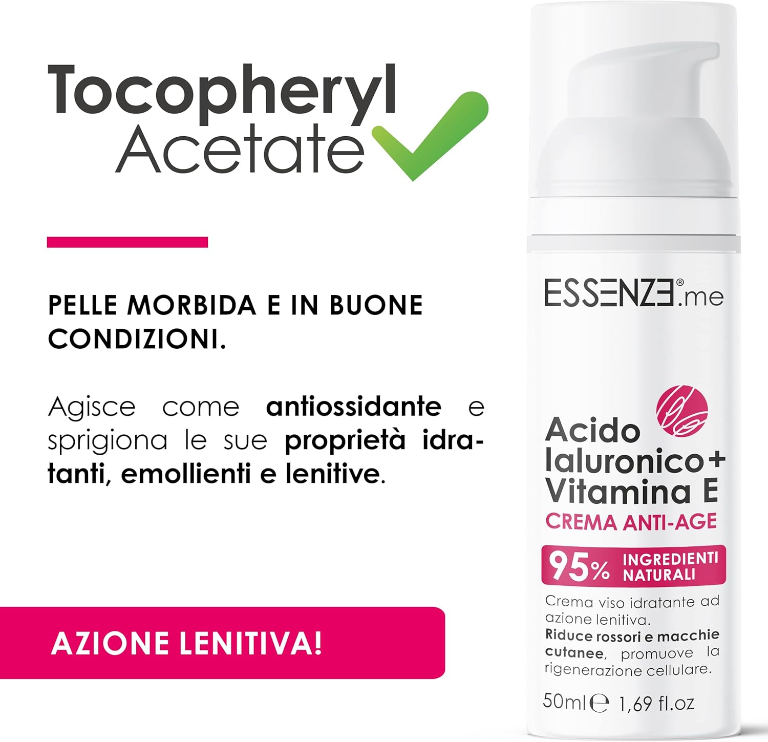 🌸 DERMATOLOGICALLY TESTED FACE CREAM: with Hyaluronic Acid and Vitamin E, scented and light texture. Essenze.me Anti-Age Cream is designed to be effective. With 95% natural ingredients, the cream feels fresh once applied to the skin, the intense but delicate scent will accompany you for a long time after application. 🌸 ANTI-AGE, MOISTURIZING AND SOOTHING designed to combine the properties of Hyaluronic Acid and Vitamin E in a single formulation: Hyaluronic Acid is formulated with different molecular weights (low and medium) to moisturize the skin on the surface and give a deeply plumping and smoothing effect. 🌸TOCOPHERYL ACETATE: For this formulation we have chosen Tocopheryl Acetate, a derivative of vitamin E, more stable and water-soluble, which acts as an antioxidant. It keeps the skin in good condition due to its ability to limit the loss of water by the epidermis. Vitamin E also contributes to the slowing down of the action of free radicals while preventing degradation of the components of the formulation. 🌸 AIRLESS TECHNOLOGY BOTTLE: Airless technology is a new packaging system that allows the product, once sealed inside the package, not to come into contact with air and fingers, preserving the properties of the cream from oxidation and possible contamination that could alter its characteristics. The cream will be the same from the first to the last application, without waste! 🌸 RIGHT APPLICATION TIPS: Cleanse the facial skin deeply and make sure it is dry before applying the cream. Spread the product over the entire surface of the face, including neck and eye area. Wait for the cream to dry completely. For normal to dry skin, you can use the cream even before makeup. It is recommended to use the cream 1, 2 times a day, morning and evening.
