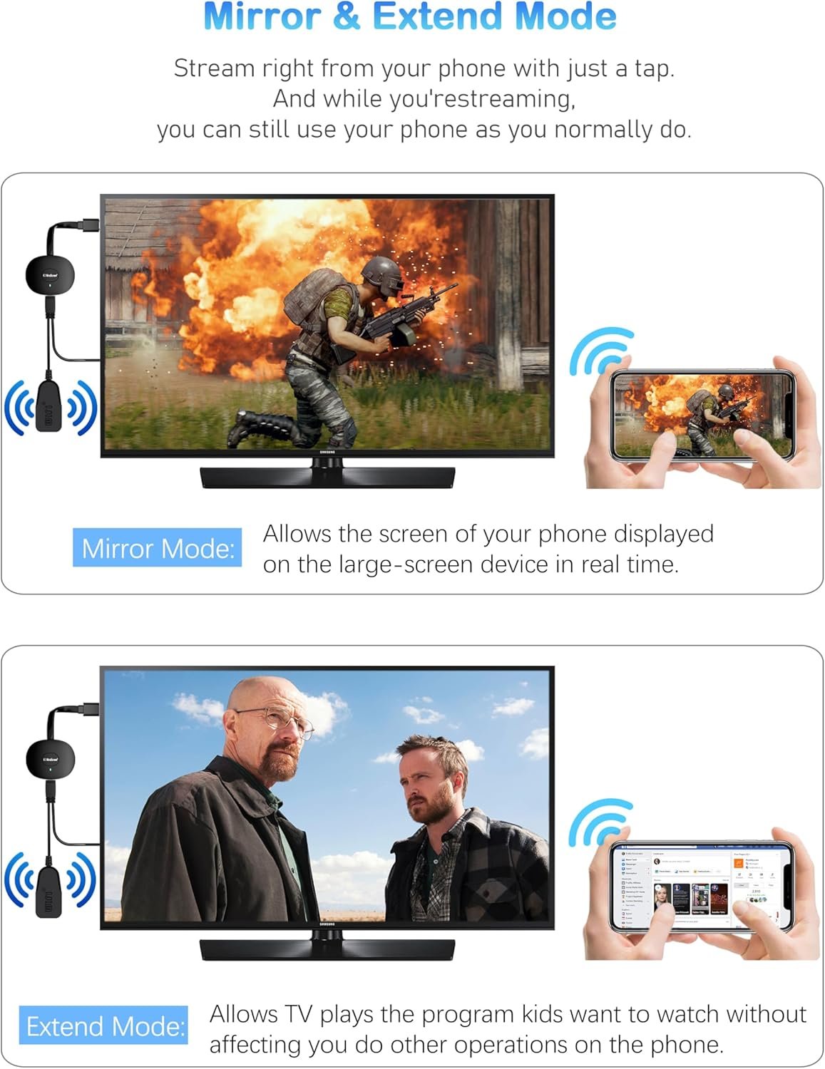 Ultra HDMI Streaming - Despite its affordable, our wireless HDMI dongle offers stunning 1080P resolution and fast, stable Wi-Fi connectivity, delivering high-quality and clear detai Images/Videos. Easy to Connectivity - Simple to set up the wireless display adapter, plug it into your TV's HDMI port, connect to Wi-Fi, and start streaming. No need for apps or Bluetooth, and it is compatible with almost any TV that has an HDMI port. Screen Mirroring and Extended - Mirror the screens of your Android and iOS devices to view audio or video on a larger display with our wireless HDMI adapter, in addition, you can use your phone as usual in extended mode. Portable and Versatile - The compact size (8 x 5 x 1 cm) makes it easy to carry around and enjoy your favorite content. No messy cables and uses very little power make it ideal for use in business meetings, classrooms, and entertainment. Wide Compatibility - Compatible with iOS and Mac, Android, Windows devices such as smartphones, tablets, laptops, and MacBook Air/Pro. Create a cinematic viewing experience to stream shows, movies, music, games, sports, photos, live TV, and over 2,000+ apps. Excellent Service - If you have any questions about the product, please do not hesitate to contact our customer service. We guarantee you 100% quality service.