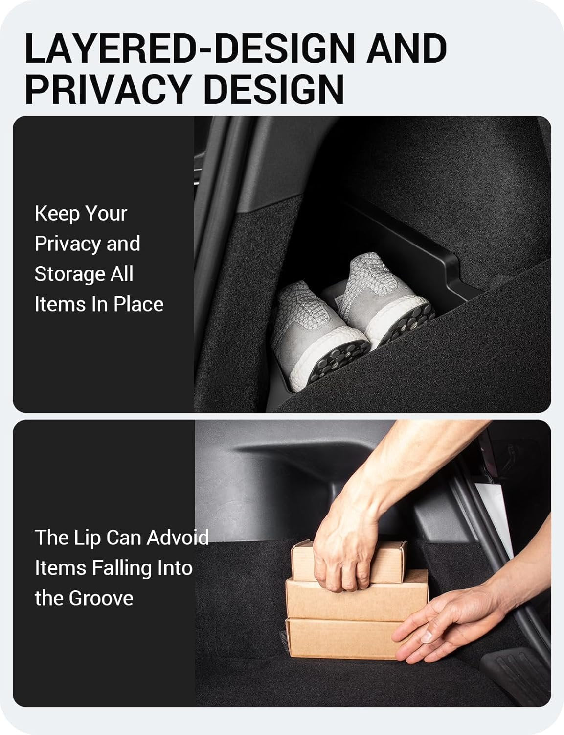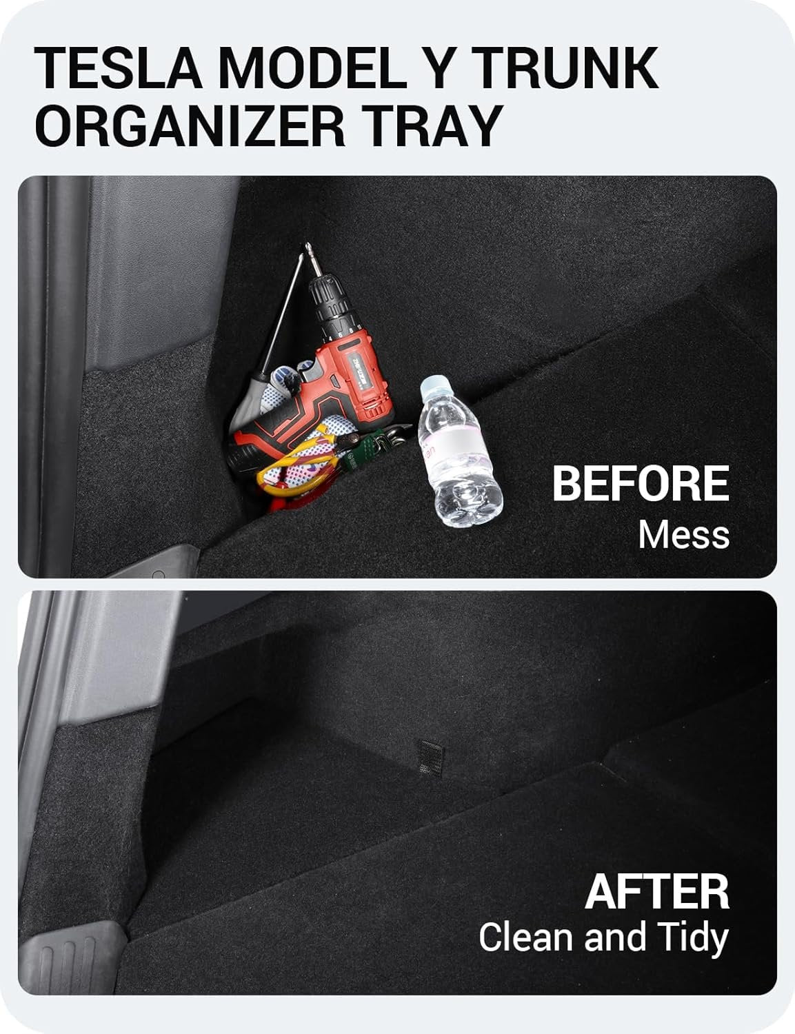 Newest Version: BASENOR presents an exceptional line of Tesla Model Y trunk side bins with a one-piece molding technique, designed to fit 2022-2025 5-seat Model Y vehicles manufactured in Fremont and Austin after July 7th, 2022. Catering to a devoted following of over 500,000 Tesla users Luxurious Material Fusion: Indulge in the exceptional quality of our Model Y trunk organizer, featuring a stain-resistant, flocked cover and a high-quality, supple TPE material storage box that effortlessly withstands kneading without deformation. Easy to Clean: Keep your Model Y trunk organizer clean and tidy with ease, as our designed organizer allows for simple access and cleaning, ensuring your belongings remain in a pristine environment. Maximize Storage Capacity: Relish the convenience of our Model Y Rear Trunk Side Storage, adept at accommodating a myriad of items such as wires, tools, umbrellas, and toys, keeping your luggage impeccably organized. Enhanced Stability & Security: Model Y trunk organizers snugly fit into side grooves, preventing movement and minimizing road noise. Provide excellent collision protection and safeguard your items inside the boxes.