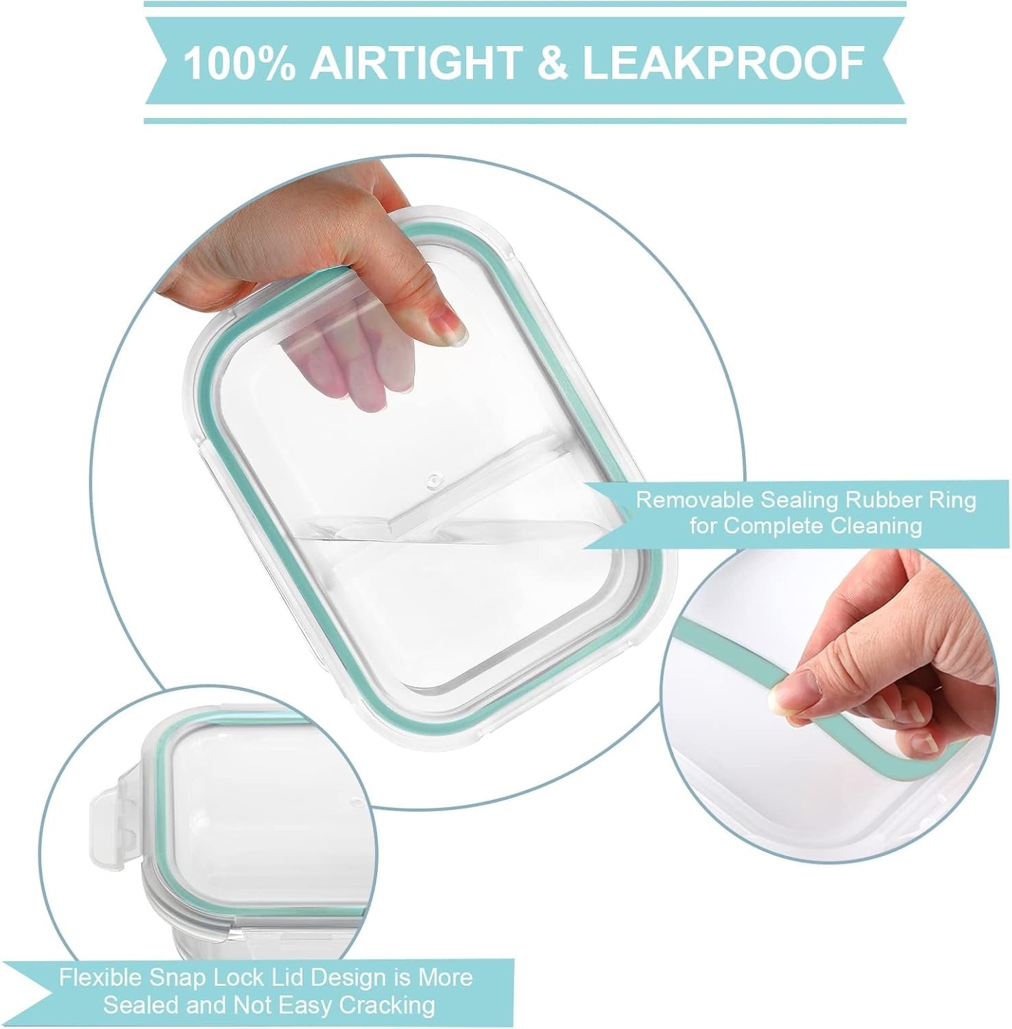 BAYCO glass containers are made from high quality borosilicate glass, which can be used for storage, cooking and microwaving.10 Pieces Glass Food Storage Containers 2 Compartments with Lids (10 lids & 10 Containers)10 packsize: 6.9(inch)x5.2(inch)x2.5(inch)Capacity: 580ml (20oz) - 2.5 cupsOur containers withstand from -5F – 700F (-20C – 400C).OVEN SAFE(NOT THE LIDS)MICROWAVESAFE(NOT THE LIDS)DISHWASHER SAFE(NOT THE LIDS)FREEZER SAFESafe material:Borosilicate GlassBPA-Free Snap Locking LidsFDA ApprovedColour:The main body of the container-Transparent borosilicate GlassThe lid of the container-Semi-transparent BPA-Free plastic Snap Locking Lids&Blue silicone sealing strip.Tips:If the containers are idle for a long time, the silicone sealing strip inside the lid may fall off. Please install the silicone sealing strip back to its original position.We suggest that you can put plastic paper on top of the glass container before closing.If you have any questions, please feel free to contact us.We'll get back to you in 24 hours.