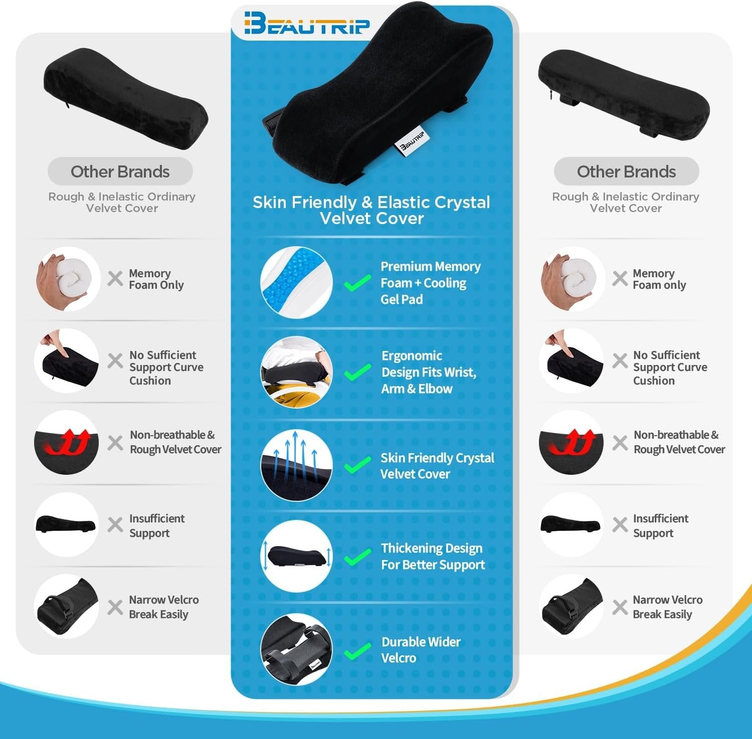 đ ăPremium Memory Foam with Cooling Gel Pad Topă -- The inner core of BEAUTRIP office chair arm pads is made of 100 percent pure memory foam with moderate hardness which provides a cozy feeling with soft touch. The memory foam cushion includes a cooling gel insert on top to maximize comfort by keeping you cool and absorbing body heat to better adapt to your contours. đ ăArc Contoured Designă -- We designed BEAUTRIP gaming chair armrest pillow with an unique arc shape which is better adapt to your wrist, arm and elbow with extra support and comfort. The armrest pad acts as a riser for office chairs, gaming chair, desk chairs and wheelchairs by increasing the height of the chair arms. âïž ăSkin-friendly & Detachable Crystal Velvet Coveră -- Along with the cooling gel pad, our armrest cushions come with breathable velvet covers to release heat. Velcro straps and non-slip particles at bottom enable the chair arm pads to be firmly installed on chairs. Hidden zipper makes velvet cover detachable for easy cleaning and machine washing. The padded armrest acts as office chair armrest covers, protecting your chair from wear and tear. Note: DON'T put memory foam in the washer or dryer. đȘ ăThickening and Widening Design Fits a Variety of Chairsă- BEAUTRIP armrest cushions measures 9.8 (L) x 4 (W) x 2.7 (H) inches and fits most chair arms between 3 to 6 inches in width. Ours chair armrest pads are thickenedly and widenedly designed with which you can get extra support and comfort. And the armrest pads fit a variety of office chairs, gaming chairs, dining chairs, reclining chairs and wheelchairs. đ ăPerfect Gift And Satisfaction Guaranteedă- Our arm rest pad not only can be used on the arm of a chair, but also can be used as the mouse wrist rest pad or keyboard wrist pad. BEAUTRIP office chair armrest cushion pads is a great gift for anyone who sitting in office for a long time. We ensure you a free return if you have any dissatisfaction with the chair arm pads. Place an order now!