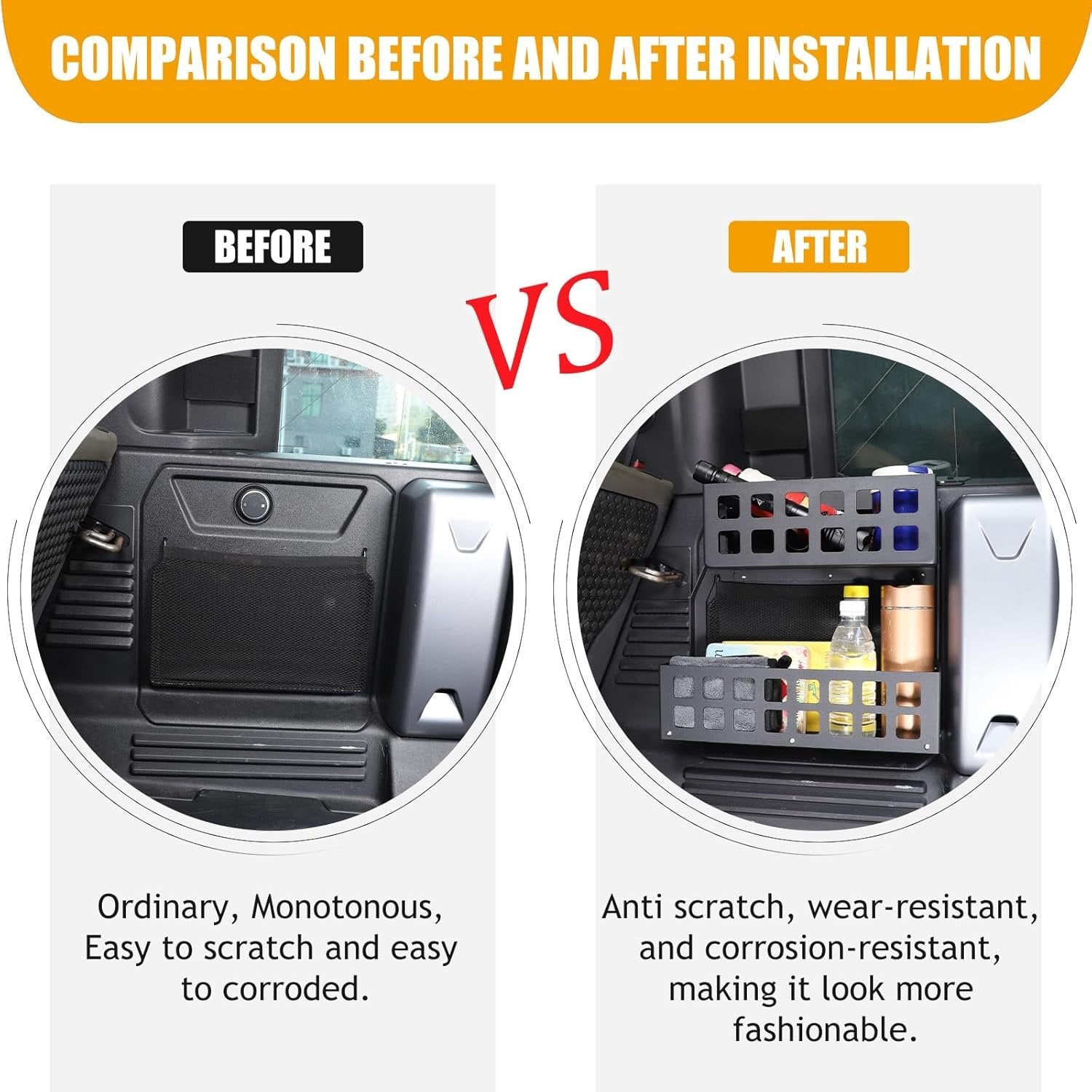【Applicable models】: The Trunk Right Organizer is compatible with the Land Rover Defender 110 2020-2024. Customized for original car size. Please check your model before purchasing. 【Additional Storage】: Personalize and upgrade your interior with an upper and lower double-layer design that increases interior storage space, provides stability and ease of organizing your belongings, fits perfectly and adds extra storage capacity for organization through these trunk storage panels. 【Material】: Made of high quality aluminum alloy material, very strong and durable, can withstand high gravity. The surface has a protective layer of electroplated film, which is corrosion resistant and has a long service life. 【Easy to install and use】:Our storage baskets come with double sided tape on the back to attach to the side of the luggage compartment. No drilling or alterations are required, whilst the top is reinforced with bolts. 【After Sales Service】: We are committed to providing our customers with high quality products and services! If you have any questions about our Land Rover Defender parts, please feel free to contact us, we will solve the problem for you within 24 hours.