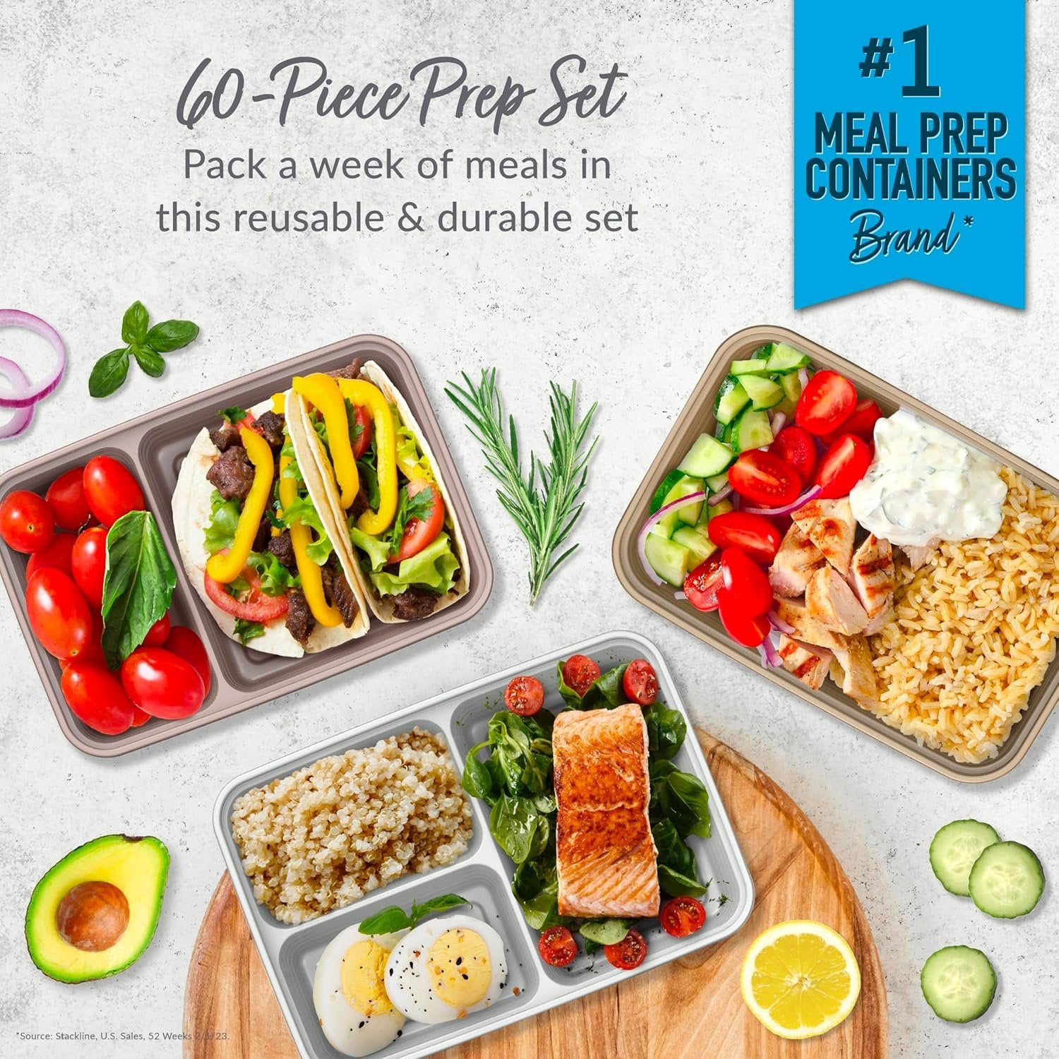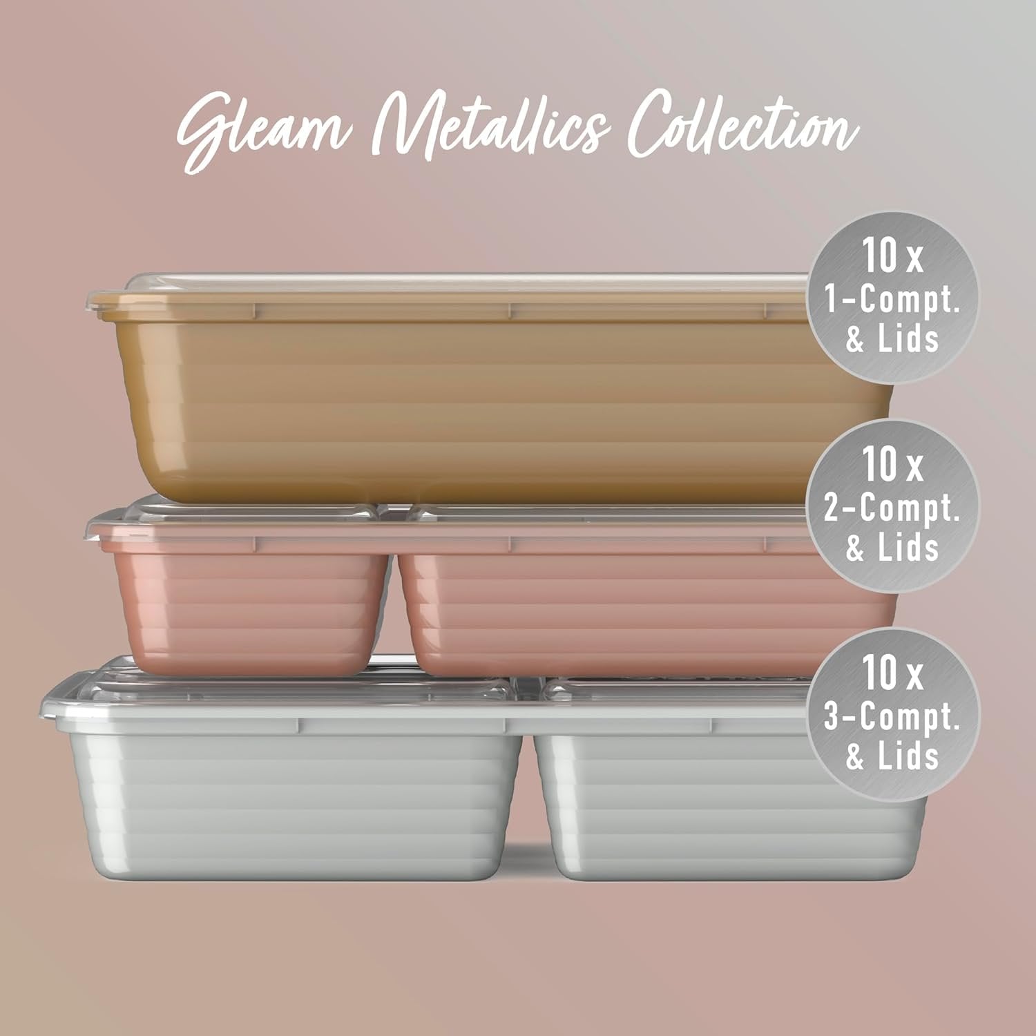 Everyone’s Favorite Meal Prep Set: Get everything you need for meal prepping in one convenient set! This durable and reusable 60-piece meal prep mix comes with 10 one-compartment trays, 10 two-compartment trays, and 10 three-compartment trays—all with their own fitted lids. Make breakfast, lunch, and dinner for the entire week or for multiple members of your family with this complete set. Portion Controlled Design: No need to measure your portions—volume is already embossed on the tray. The custom-fit lids keep food fresh all day long and stack together neatly to save you space in your pantry. Easy To Heat & Clean: Safely heat up your food straight from the freezer or refrigerator for warm, delicious meals and leftovers. Each BPA-free meal prep container is both microwave and top-shelf dishwasher safe. Note: before microwaving, open the lid corner to allow steam to vent. For best results, hand wash to extend the life of the product. What You Get: 10 one-compartment trays, 10 two-compartment trays, 10 three-compartment trays, 30 custom-fit lids, downloadable recipes, and caring customer support.