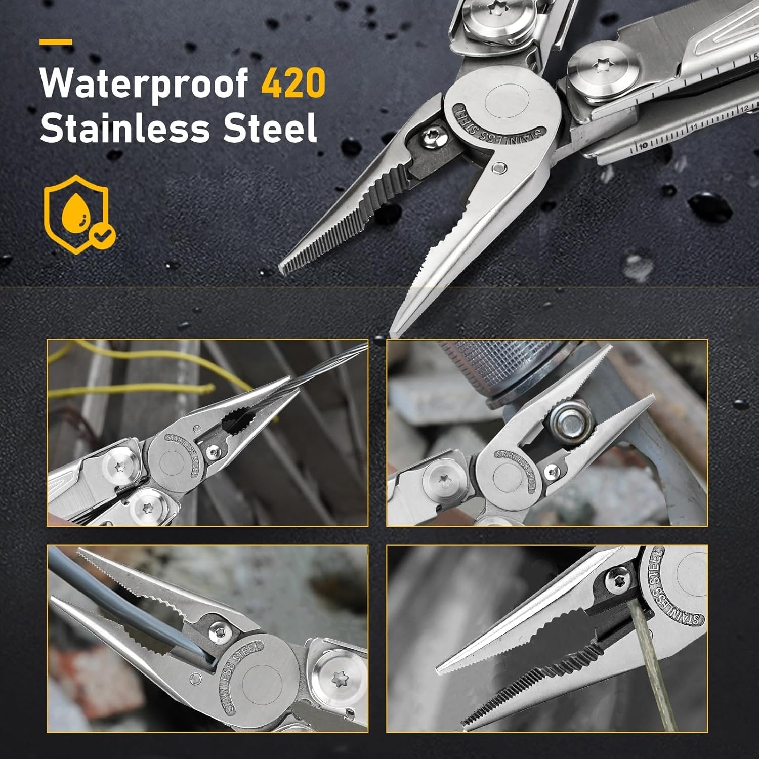 【Instant Tool Set】 The BIBURY multi tool including pliers, wire cutters, wire strippers, saws, rope cutters, spring scissors, rulers, can openers and bottle openers, files and Replaceable screwdriver, etc. Ideal for outdoor activities like camping, fishing, hiking, cooking, picnic, DIY and more. 【Security Self-Locking Design】The remarkable self-locking structure applied to all tools in the handles makes you open and close the tools more quickly. Once you finish your job, press the lock then keep the accessories in place. Creating a safe and reliable tool is our goal! 【Sturdy and Durable】 The whole Body of the BIBURY Multi-Tool are made of 3Cr13 (high hardness stainless steel), which makes the pliers up for much heavy-duty and harsh environment. This portable multitool will not rust for a long time and can guarantee years of reliable performance. Suitable for outdoor or indoor activities, gift idea for dad, boyfriend. 【Convenient and Portable】 The multi-tool comes with a hard-wearing pouch with a buckle design. And with the tool's lightweight, folded design, you can store these multitool pliers in your pocket and always have them with you when you need them.(Note: In order to close the pliers more smoothly, we recommend that you first close the pliers head and the bit part, and then fold it.) 【Customer Service】BIBURY team provides customers with quality products and services. If you have any problems after the purchase, please contact us without any hesitation. We will do our best to solve problems and meet your requirements.