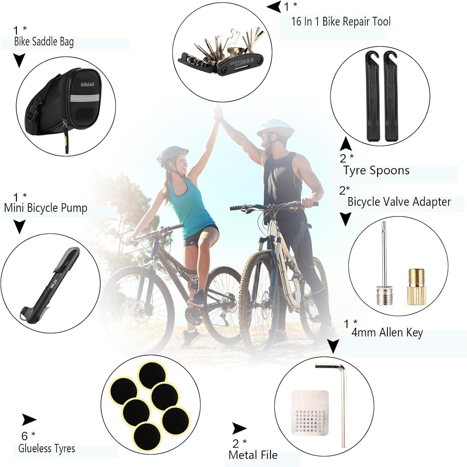 Bike Repair Tool Kit - Bike Saddle Bag and Emergency Tool Repair Set with 16 in 1 Multi-Tool Bicycle Pump, Tire Lever, Glueless Tires, Used for Mountain and Road Bike