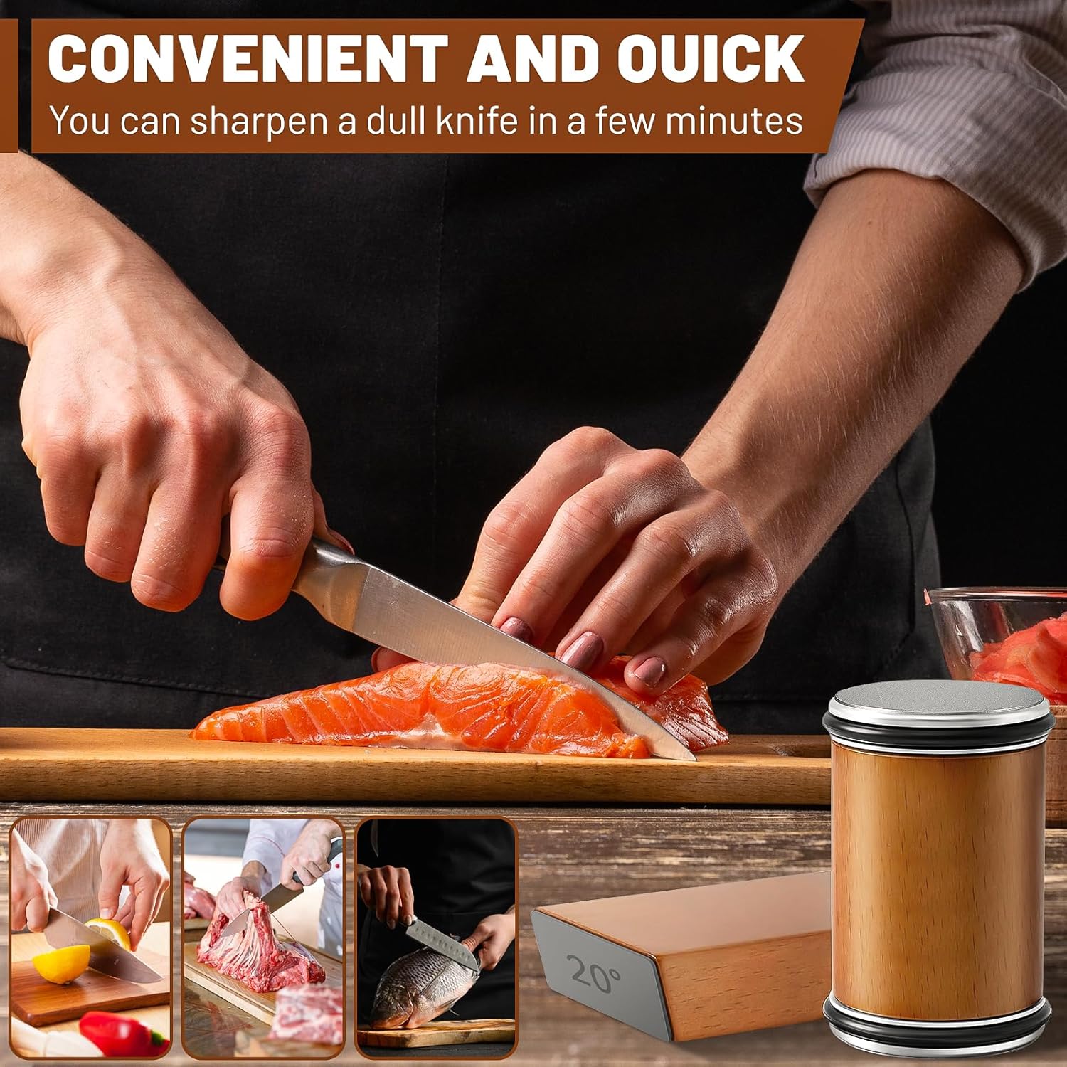 【Precision Dual-Angle】Knife Sharpener is engineered with dual-angle slots. This Knife Sharpener caters to professional sharpening standards, while the 15° slot perfect for Japanese-style santoku knives and fillet knives requiring razor edges, while the 20° slot maintains optimal edge retention for cleavers and hunting knives. The anodized aluminum angle from the Knife Sharpener guides prevent over-grinding that damages blade integrity.