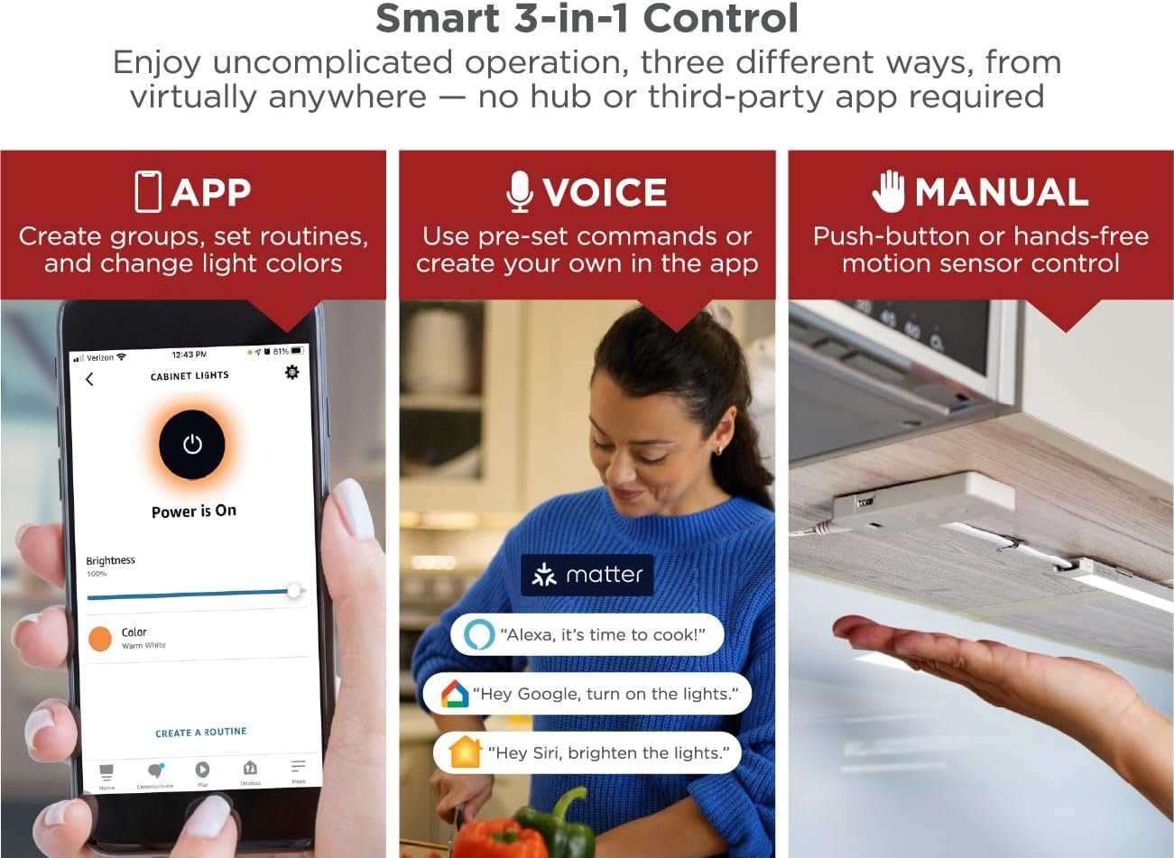 SMART HOME INTEGRATION WITH MATTER: Works with Apple Home, Amazon Alexa, and Google Home for ultimate convenience; no third-party app required. Use voice commands or your preferred smart home app to control power, dimming, and light color ALL-INCLUSIVE KIT FOR YOUR CONVENIENCE: Contains (6) 12" ultra-thin light bars, (1) 25' CL2-rated wire, (1) 48-watt direct or plug-in power adapter, (1) Matter control box, (18) wire clips, and (12) light bar mounting clips PUREOPTICS LED TECHNOLOGY: High performance LEDs are up to 3X brighter than similar under cabinet lights to dramatically elevate any space in your life. Each 12" light bar boasts 300 lumens and lasts up to 50,000 hours FULL COLOR RANGE FOR A BALANCED ATMOSPHERE: Select warm to cool white light or pick a range of 16 million vivid colors to suit your mood. Stepless dimming and a variety of custom modes allows you to set the perfect scene for any occasion PUSH-WIRE PRO INSTALLATION SAVES TIME AND MONEY: Simply cut, strip, and push the wires into the WAGO connectors on each light bar for the most flexible install available, allowing for easy on-site customization; no pre-planning required!