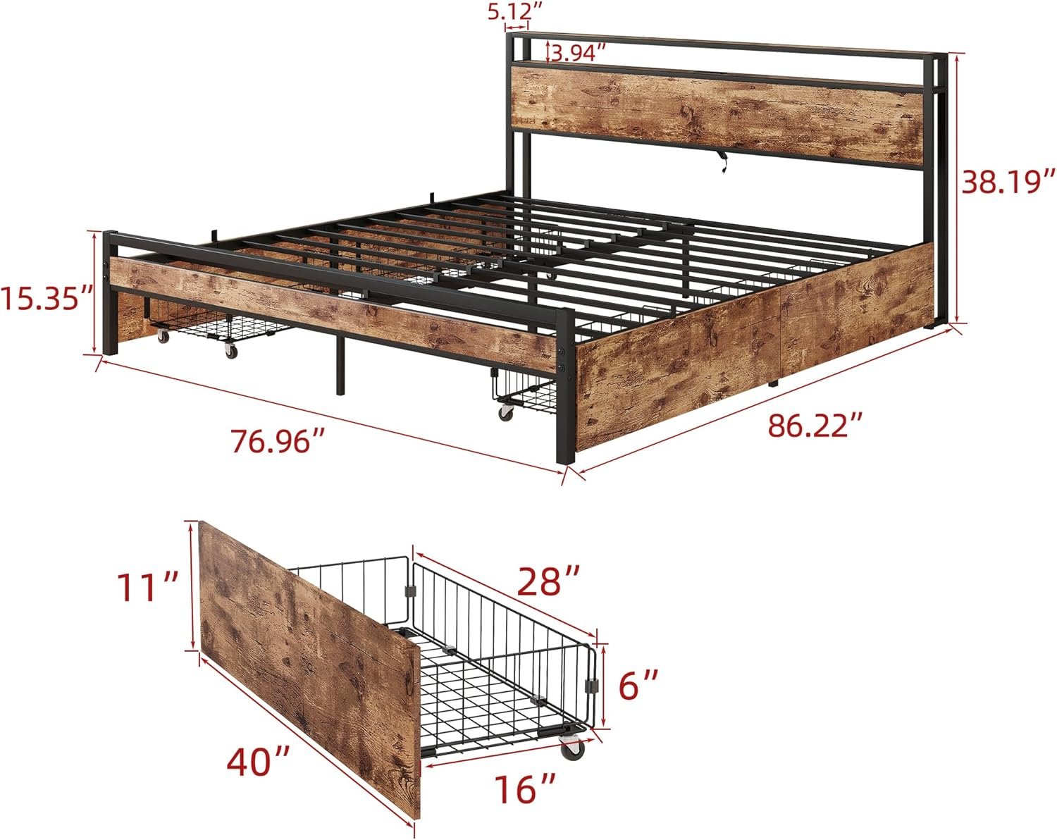 【Ideal Size and Enough Weight】King bed frame size: 86.22” x 76.96” x 38.19” (length x width x height), weight: 136.60 pounds. Mattress not included. 【Practical Design and Strong Support】Practical 2-Tier Storage Headboard can be easily placed some small items,such as your phone,glasses,decoration etc.The board are made of 1.5" wide high-quality steel pipes. Heavy-duty steel slats prevent sagging, are strong enough, it can provide your mattress with a load-bearing capacity of 880 pounds. 【Ample Storage Space】Designed with 4 Roll-out storage drawers at the side, this queen size storage bed offers perfective storage space for bed sheets, accessories, off-season clothing, etc. Maximized the bed space utilization, keep your room looking tide and clean. 【Classic and Elegant】Ultra-high-quality P2 grade MDF Board, sturdy, waterproof and scratch-resistant. This retro bed frame looks classic and elegant, and can match any color scheme in the room. 【Sturdy and Stable】New reinforcement design.The newly upgraded structure brings very superior durability and stability. 【Easy to Assemble】The assembly instructions are very clear and easy to understand, and each part has a clear label. Everything is included in the package and no additional tools are required. Please follow the instructions for assembly.