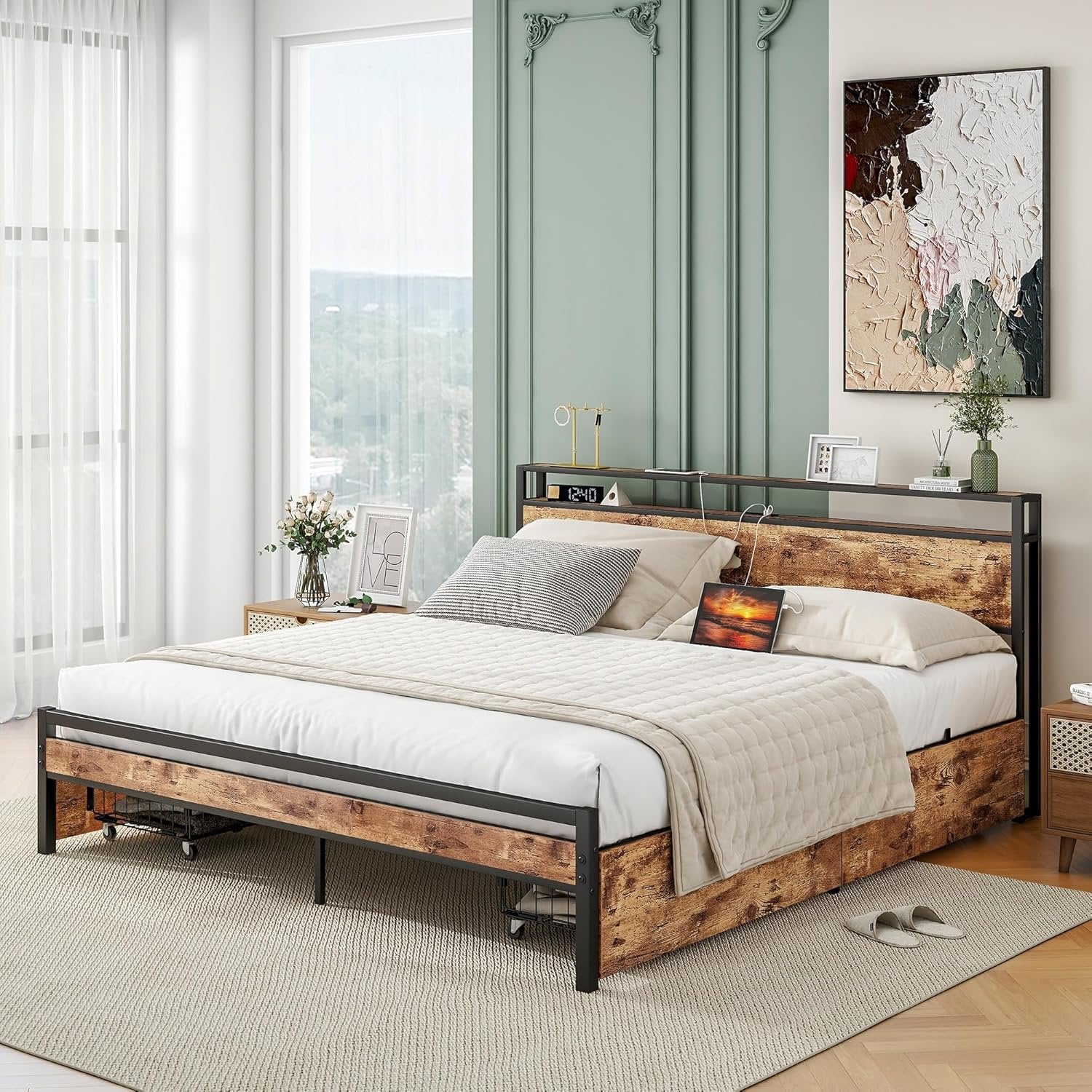 BOFENG Black King Size Bed Frame with 2-Tier Storage Headboard and Power Outlets,Charging Station,Platform Bed Frame King Size with 4 Storage Drawers,No Box Spring Needed,Sturdy and Noise Free,Brown