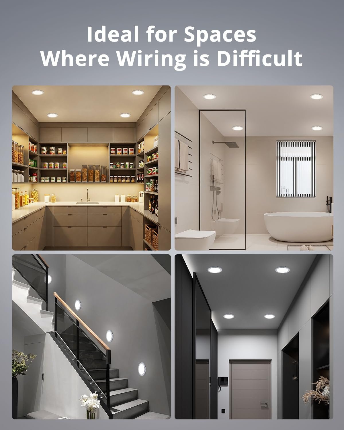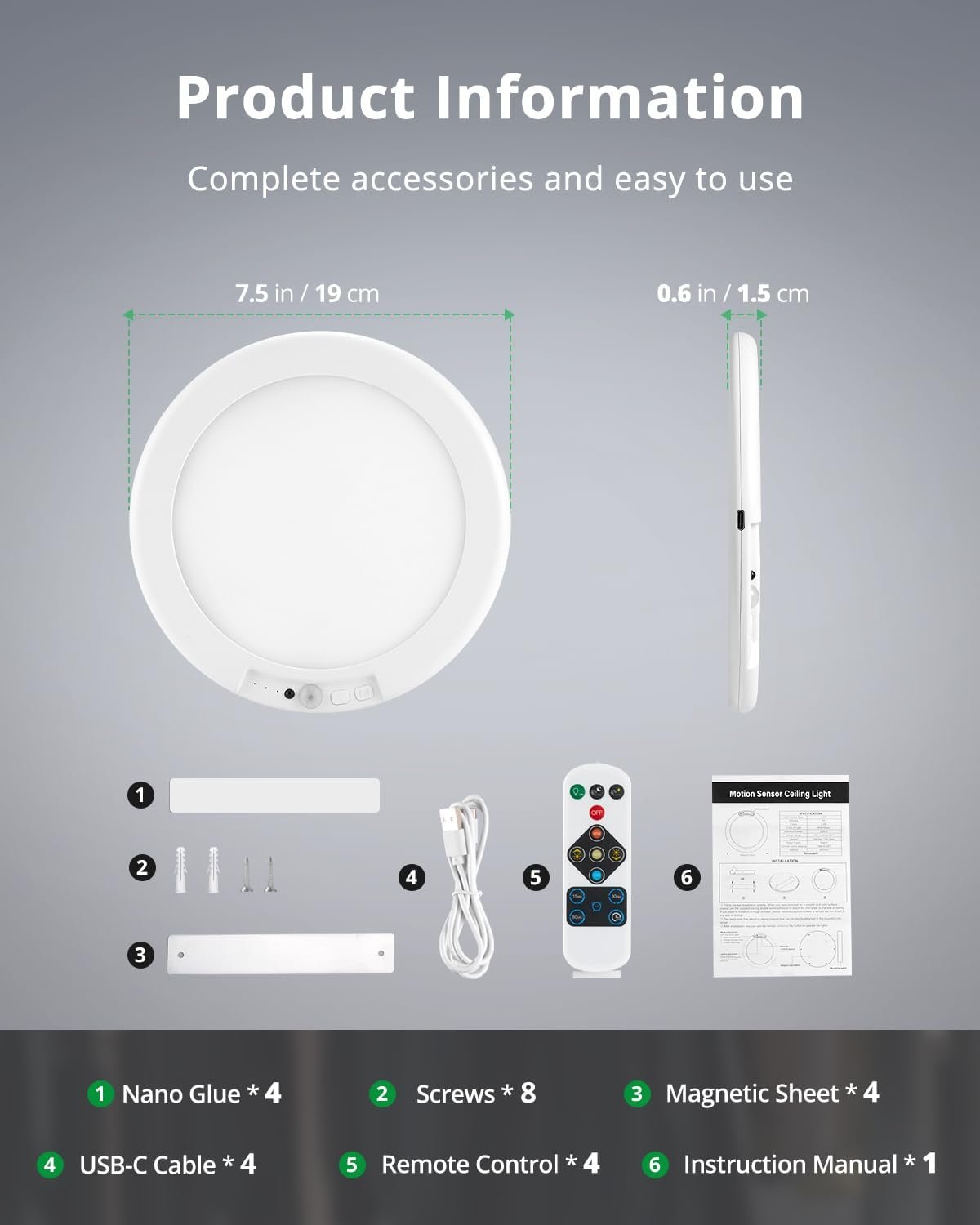 [5000mAh Long-Lasting Battery] Bojim rechargeable ceiling light 4 pcs features a 5000mAh battery (USB-C charging) with LED indicators(Red light: Charging, Green light: Fully charged). Lasts 13hrs (constant), 25 days (daylight-sensing), or 45 days (night mode). Ideal for closets, bathrooms, garages, or hallways—no outlets needed. [Motion Sensor + 3 Smart Modes] "M": long press to turn on the led lights set of 4, short press to switch the 3 sensing modes. Auto-triggers within 13ft, lighting up for 20s. Choose Night Sense (bedrooms/pantries), Day Sense (garages/sheds), or Constant Light (showers/kitchens). Saves energy and battery life. [3-Color Dimming Control] "Bulb": short press to adjust color temperature between 3000K/4500K/6500K for warm, natural, or cool white. long press to adjust brightness (5%-100%). Perfect for cozy bedrooms or bright task lighting in closets/workshops. [Easy No-Wire Installation] Install Bojim magnetic light in minutes with adhesive (easy and fast) or punch installation (stable and reliable). The magnetic design makes it very convenient for you to take off the light to charge. Note: The minimum mounting distance between two or more motion sensor lights is 4.92 ft /1.5m to ensure better sensing function of the products. [Remote Control & Timer] Adjust modes, colors, brightness, and set 15/30/60-min timers via remote—turn off Bojim ceiling battery light from bed without getting up! Perfect for bedrooms, pantries, or late-night showers. Total convenience at your fingertips.
