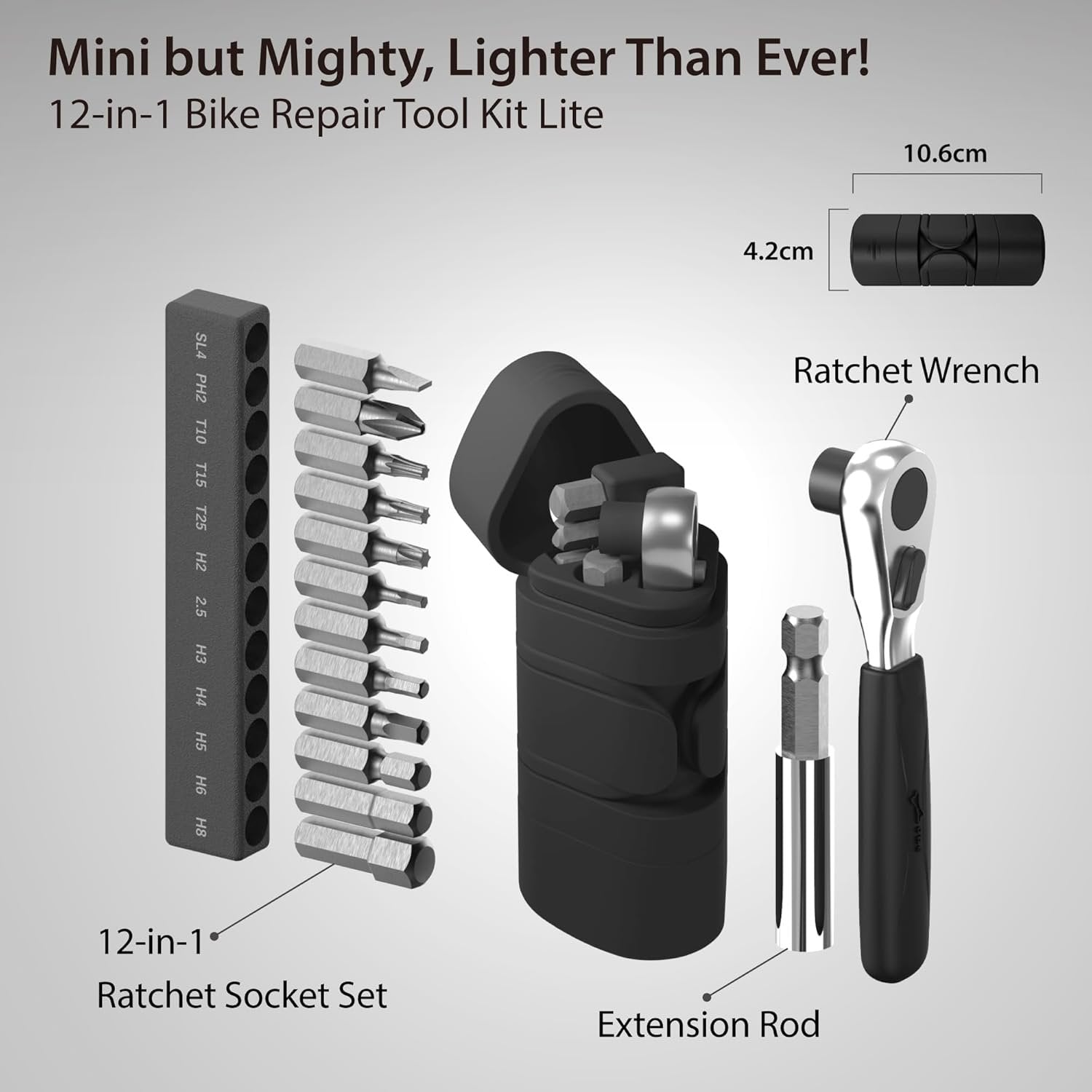 BONE 12-in-1 Portable Bike Tool Kit Lite, Compact Bicycle Maintenance Capsule with Ratchet Wrench Tool Set, Mini Essential Accessories for Bikes and Home, All-in-One Emergency Repair Solution