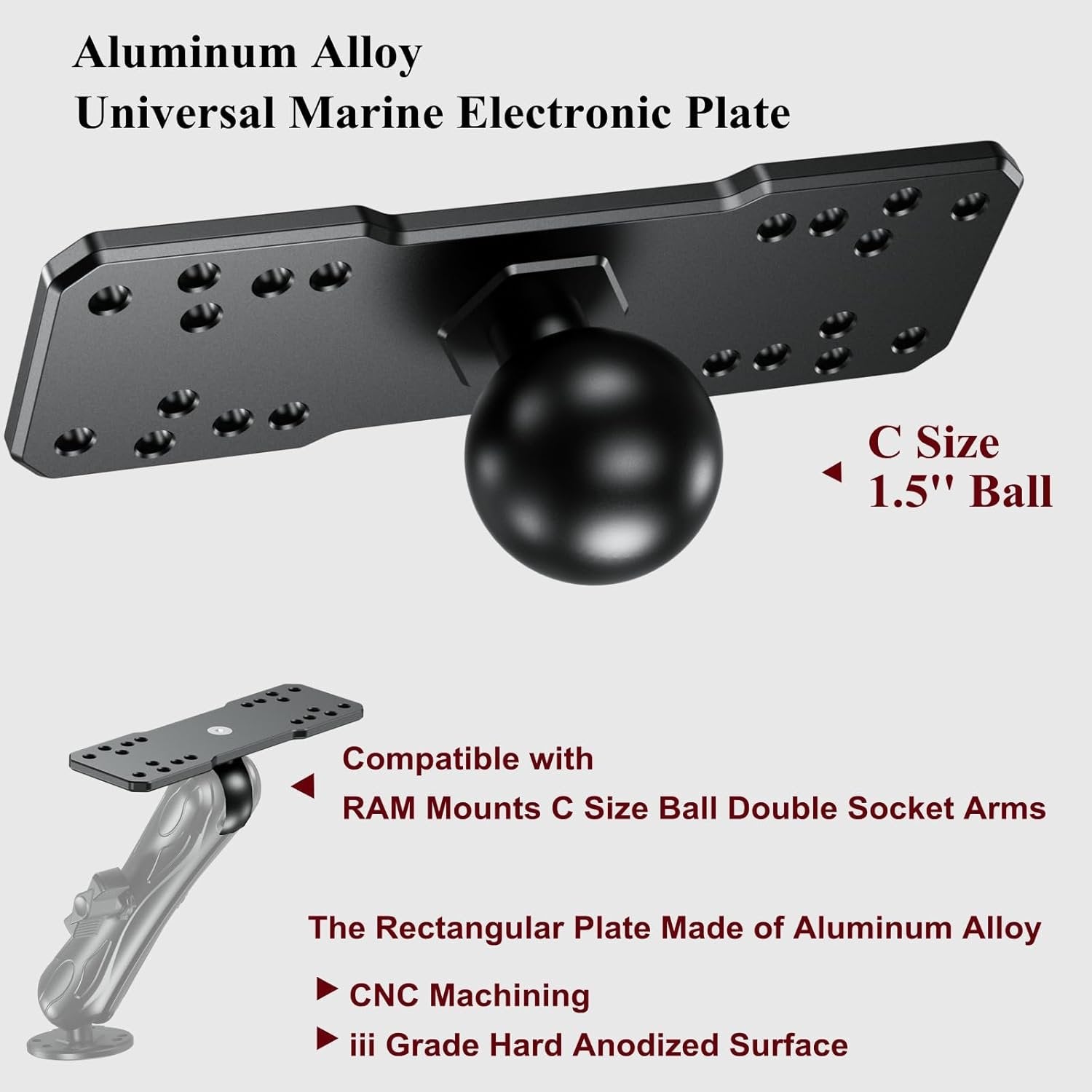 BRCOVAN Aluminum Alloy Marine Electronic Plate with 1.5'' TPU Ball for RAM Mounts C Size Double Socket Arm for Garmin/Humminbird/Lowrance GPS Chartplotters, Fishfinders and Marine Electronic Mount