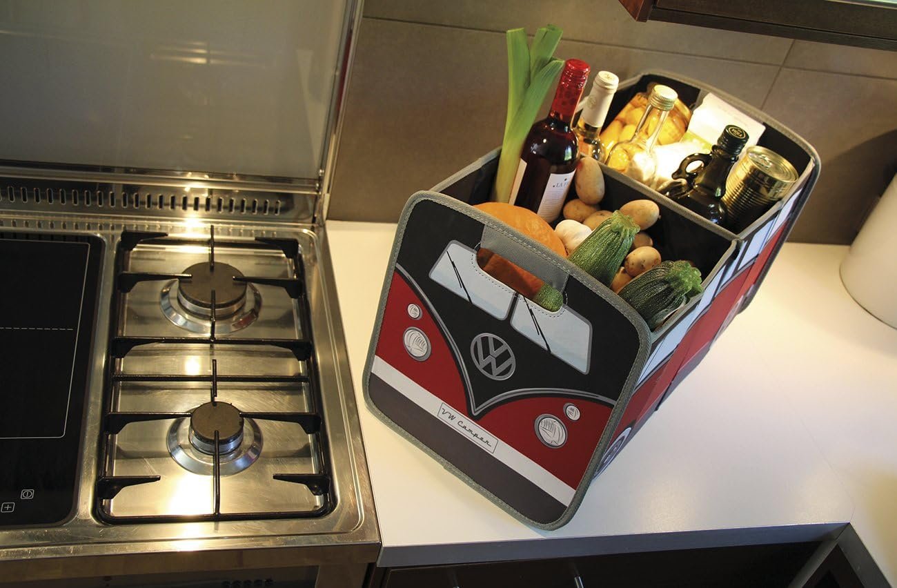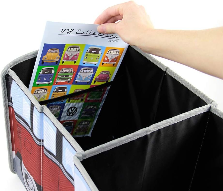 CLASSIC Bus/RED & BLACK: The 3D folding box is designed in red and black, resembling the VW T1 Bus. Dimensions when folded: 33 x 30 x 5 cm (13 x 11.8 x 2 inches); when opened: 33 x 30 x 58 cm (13 x 11.8 x 22.8 inches). PRACTICAL Details: Our boxes with reinforced walls and a bottom plate can be easily folded together and secured with an elastic band. When assembled, there are 2 large main compartments and 2 practical mesh inner compartments. MULTIFUNCTIONAL: A versatile all-rounder, as the folding box can store your groceries in the trunk, books and magazines in the living room, and much more. TECHNICAL Details: The VW T1 Bus storage boxes are made of durable Polyester D600 and Nylon. Comfortable carrying handles are integrated on the left and right sides. It can withstand loads of up to 30 kg (66 lbs). OFFICIALLY LICENSED: The folding boxes in shape of a VW T1 Bus are an officially licensed Volkswagen product. Our items are developed in Germany to meet our high-quality standards.