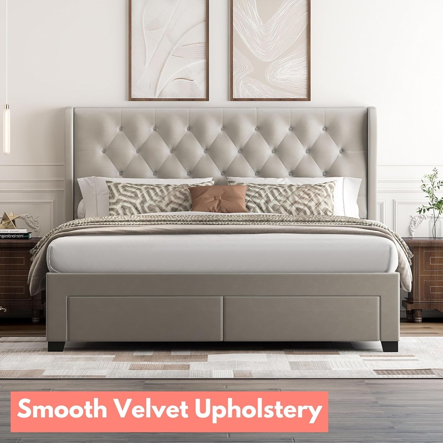 No Box Spring Required – Thick side rails and wooden slats support your mattress with or without a box spring. Elegant Design - Brittany Queen is a low profile spacious bed with the Queen Size dimensions of 86" Length x 68'' Width x 46'' Headboard Height Storage Drawers - It comes with 4 drawers for storage. 2 in the front and 1 on each side gives you ample of room for your daily storage needs. Linen Fabric Upholstery - Dark Grey Colour Variant of this elegant upholstered bed frame is available only in Linen Fabric. Velvet Fabric Upholstery - Ivory and Light Grey Colour Variant of this elegant upholstered bed frame is available only in Velvet Fabric. Minimum Effort and Easy Assembly - This bed frame is easy to assemble with an instruction manual. Convenient to pull out drawers making it effortless.