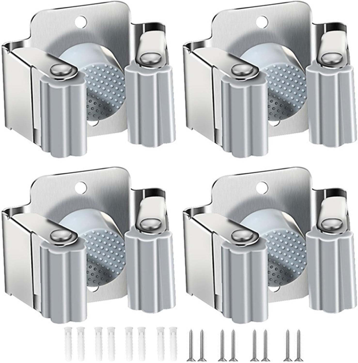 STURDY Stainless Steel:Corrosion-resistant, moisture-resistant, and waterproof. Designed for the best combination of stability and clamping force. And this broom hanger wall mount can hold up to 2.5 kg. What's more, the set includes 8 screws & dowels each - so your broom holder wall mount is ready to use right away! Space-saving: Can be attached individually and placed individually. Once you clamp the broom handle into the triangular clip, it automatically adjusts to the different thicknesses of the handles and locks it without slipping Cleaning Tools Organizer&Garage Storage: This wall mount holder is suitable for organizing cleaning supplies, garden tools, sporting goods, kitchen utensils, bathroom accessories, and hardware tools. The command broom holder is the best companion in your kitchen, bathroom, garage, laundry room, and even in your garden shed to keep your work area clean and tidy Easy To Use:You can slide the broom in and out with one hand. Unlike plastic holders with spring-loaded rollers, this broom organizer wall mount has rubber rollers to hold the handles, allowing the handle to slide in from the front and be held firmly in place. You don't have to worry about hurting your hand Fabulous Home Decor:These broom and mop holders are great for organizing all of your cleaning supplies It’s also really easy to grab things off of it, you don’t have to yank to hard to grab your broom,No more worrying about them falling or slipping