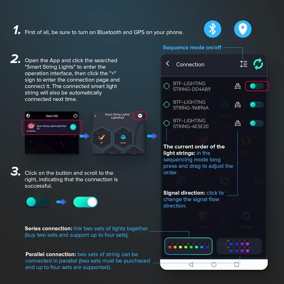 【App and Infrared Remote Control】Use your phone to scan the QR code on the controller to download the APP "iDeal LED", connect the light via Bluetooth, you can easily change the color and mode of the lights. An infrared remote control with 38 buttons is also provided, the remote control makes it simple to change the colors, patterns and brightness to your liking. 【Built-in Microphone Sync with Music】Because the smart Christmas lights come with built-in microphone, fairy string lights can change according to the beats of music, different sounds and even your voice. Sensitivity can be adjusted. Both the IR remote and APP are equipped with 4 kinds of lighting effects, including energy, pace, spectrum and rotation. 【100LEDs/string.Total 200LEDs Multi-function.Easy to use】Group control, multiple fairy string LEDs can be grouped and controlled at the same time.Rename different devices.Set times and timers. With a USB port, this fairy lights plug in could be powered by any power source with USB interface or DC5V power adapter. Durable fairy lights (PVC Covere copper wires). It is cuttable. Memory function. Automatic cycle reproduction. 【Dream Color Widely Used and Safe】DC5V is safe for children. Installation is extremely simple, plug and play. The copper wire is easy to bend into any shape. It is very suitable for children's room, Christmas tree, stairs, curtains, garden, ceiling, bar, cafe, etc. it is very suitable for all kinds of party and festival decoration. You can also decorate various gift boxes and various decorative toys suitable for DIY or as gifts.