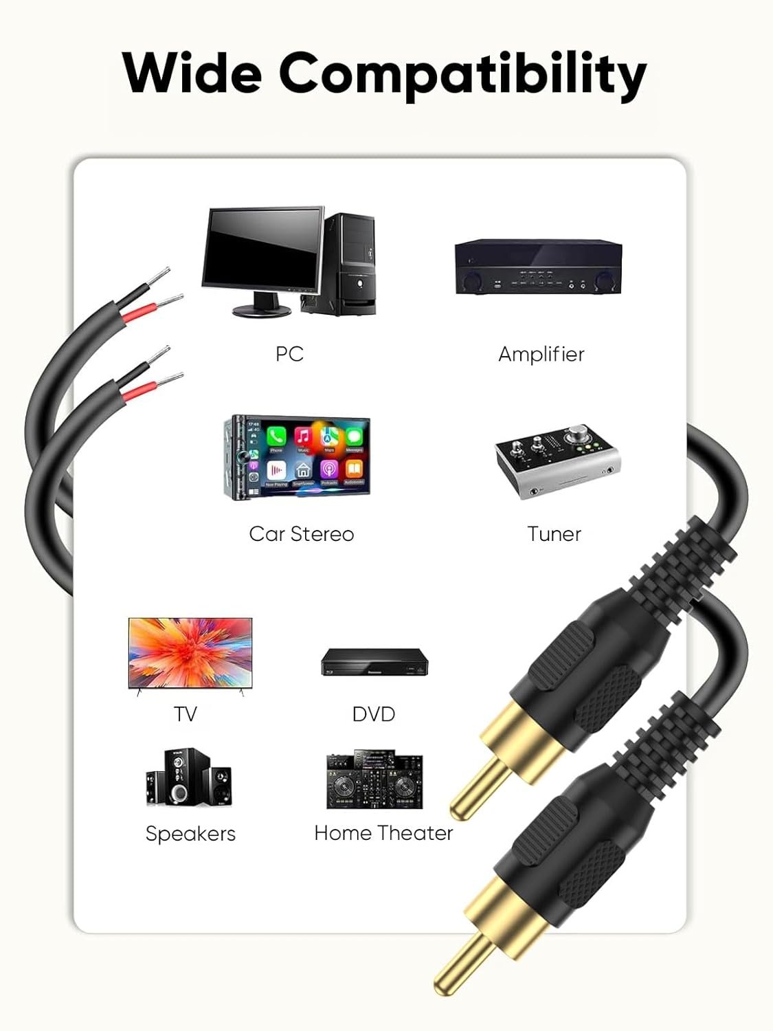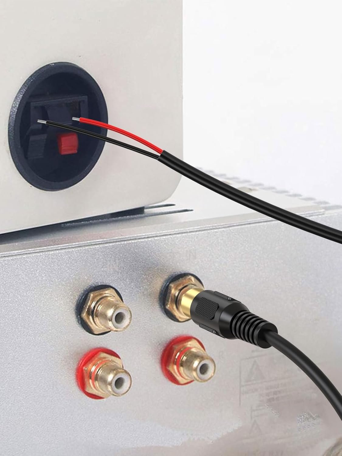 Replacement RCA for Repair: This is RCA male plug adapter connector to bare wire open end speaker wire audio cable 20AWG Wire Gauge: CableCreation speaker wire to rca adapter is made of high-quality 20AWG wire gauge, refuse to cut corners, alloy rca plug, 20awg high purity oxygen-free copper conductor, make the audio signal transmission less loss, achieve high quality sound quality Easy to Repair: Plugs in two colors, red and black, are easy to distinguish. The red wire corresponds to the RCA plug center(positive electrode), the yellow wire corresponds to the RCA plug shell (negative electrode) Wide Compatibility: This rca to bare wire speaker cable is mainly used to repair worn or damaged RCA to bare wire speaker cable for subwoofer, DVD players, HDTVs, speakers, stereo receivers, audio and video AV receivers, amplifiers, tuners, home theater systems, hi-fi systems and other devices What You Get: You will get 2 Pack 3.3FT RCA to Speaker Wire Adapter Cord. Warranty: CableCreation Provides 24-month product replacement warranty and lifetime-friendly technical support. If you have any concerns, please feel free to contact us for assistance
