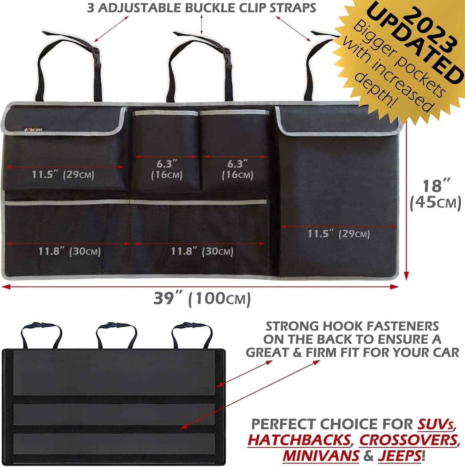 PERFECT SIZE & UNIQUE DESIGN - Providing enough storage with a variety of different-sized pockets to meet your different storage needs. The size of this trunk backseat organizer was designed to fit SUVs, Hatchbacks, Crossovers, Minivans, MPVs & Station Wagons. It measures 39” x 18” (100cm x 45cm) and when not in use it can be folded to 10” x 11” (25cm x 28cm). FAST & EASY INSTALLATION - Just clip it around your seat headrests, adjust the 3 straps and attach the hook fasteners from the back of the organizer to the back of your backseat and you are done. When not in use just take it down, fold it and put it away. Doubles as a front seat organizer as well in case you need to move it from the back seat. TRUNK ELASTIC STRAP BELT INCLUDED - We are including a great, easy to use and practical trunk elastic hook & loop strap, to match your hanging trunk organizer and help you to clear up your trunk floor. It measures 2” x 24” (5cm x 60cm) and it helps you to secure down tools, safety kits or other essentials from moving around in the trunk. FREE UP YOUR TRUNK FLOOR - 4 pockets & 2 mesh pouches with enough room for all of your daily car essentials, emergency equipment, tools, kids toys, baby supplies, pet supplies, sports gear or groceries to keep your trunk clean and organized. Most importantly it doesn’t take up room on your trunk floor like a regular box organizer, adding valuable extra cargo storage space. DURABLE CONSTRUCTION & QUALITY MATERIALS - Our products are backed by high-quality polyester construction, reliable durability, quality top stitching, high-quality adjustable buckle clip straps, heavy-duty hook fastener, scratch and tear resistant structure. It’s a great choice for SUVs, Hatchbacks, Crossovers, Minivans, MPVs & Station Wagons.