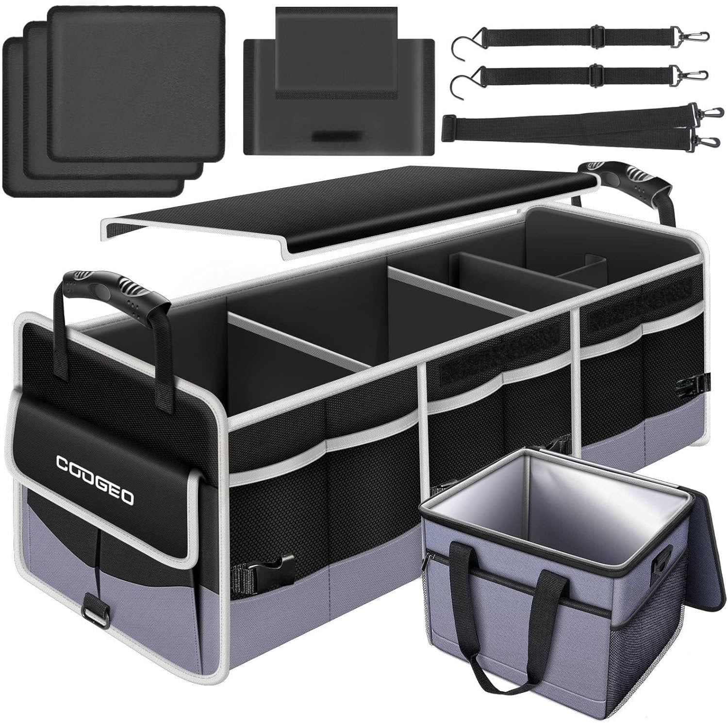 Car Trunk Organizer with Portable Leak Proof Cooler Bag, 3 Compartments Collapsible Car Organizers and Storage with Foldable Cover, Adjustable Securing Straps for SUV, Auto, Truck, Minivan