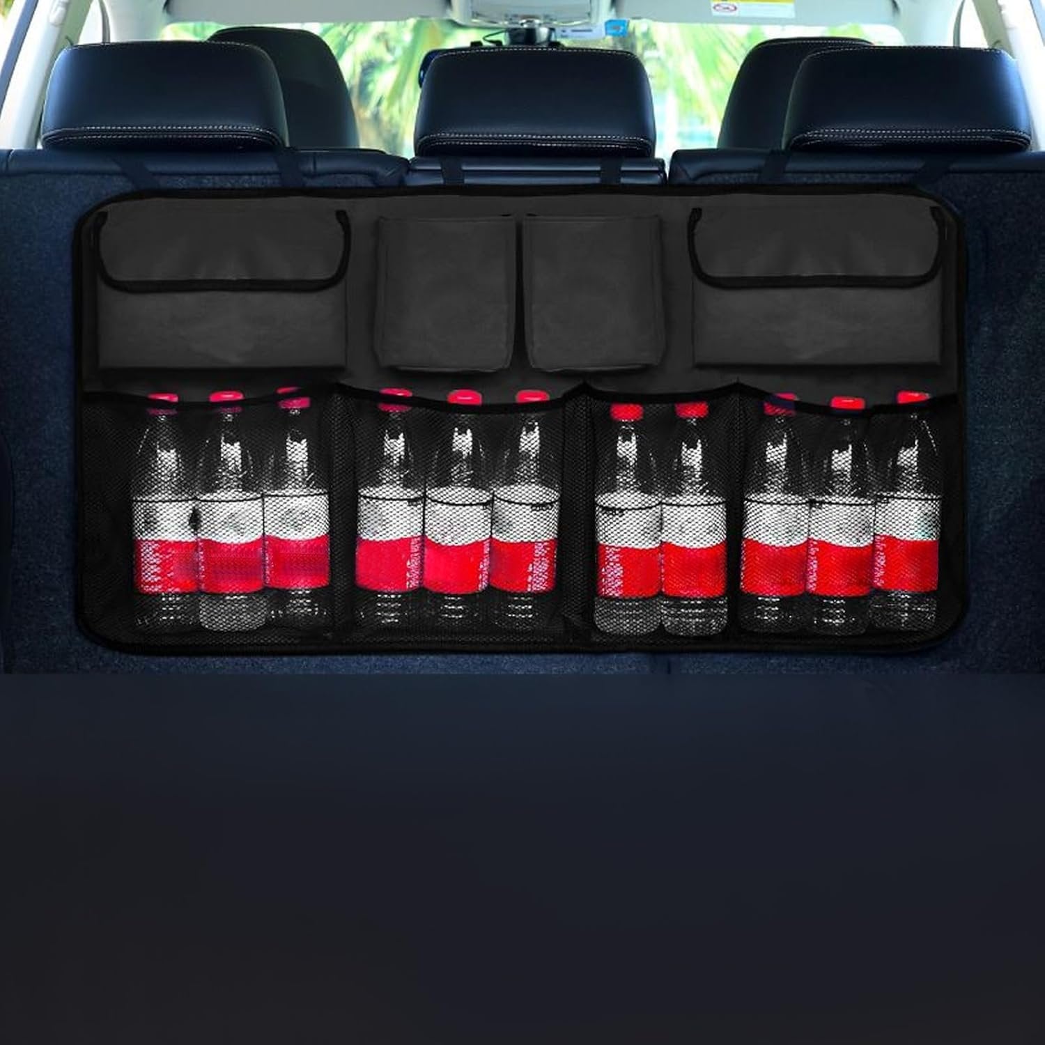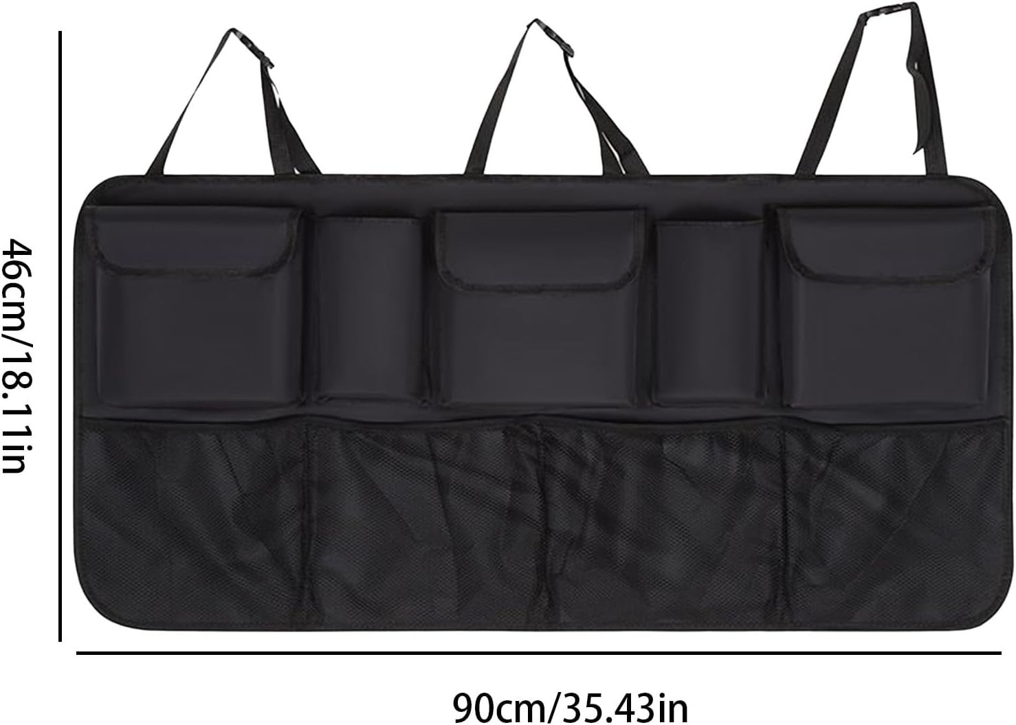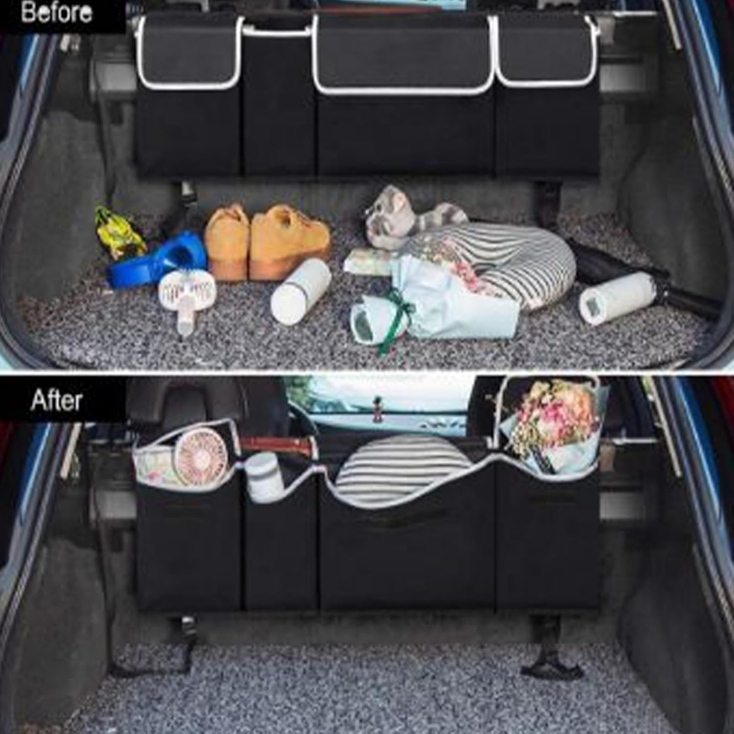 Sturdy Build: Car Trunk Organizer keeps your car organized with multi-item storage and a waterproof material design for lasting in-car environment cleanliness Easy to Install: Designed for travel safety assurance, it includes quick-release buckles, adjustable straps, and anti-shake fixation, achieving general compatibility for organizing car trunks securely and efficiently Smart Compartment Design: With hook and loop close partitions for secure placement, this organizer ensures proper item categorization and space optimization, featuring reinforced mesh pockets that provide durability and versatility for car trunk use Widely Applied: Combines a large capacity and versatile functionality with adaptable sizing to fit sedan and MPV trunks for comprehensive organization Easy Clean: Designed to provide hygienic storage, its spill-resistant construction allows quick wipe-off cleaning, blending perfectly into everyday routines as a must-have car accessory