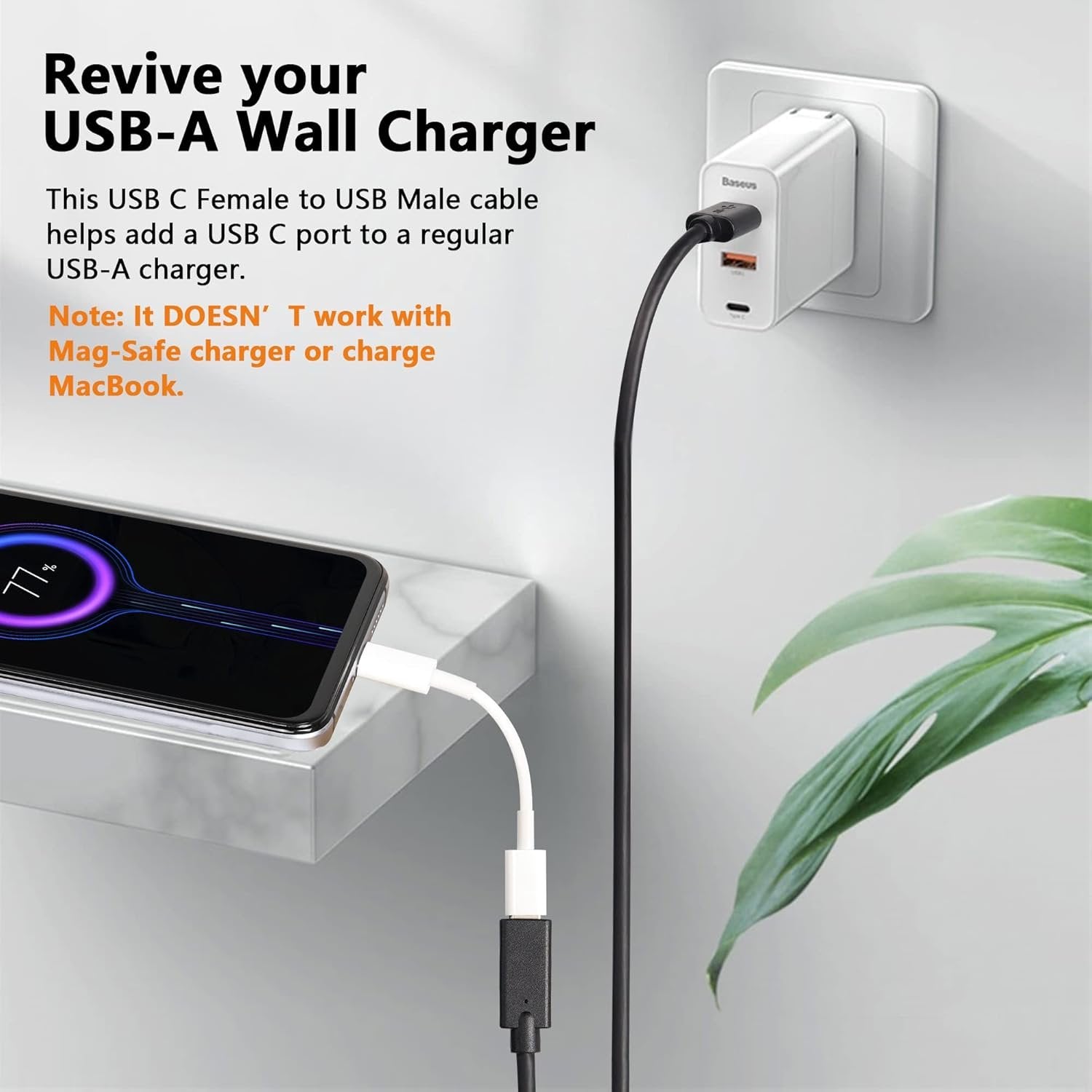 ADD USB-C INTERFACE DESIGN - (Not Compatible with MagSafe wireless charger.)This adapter is designed to add a USB Type C female port to an old Type-A laptop or PC, connecting a USB Type-C cable, a USB Type-C hub, and a USB Type-C peripheral.NOTE: It will NOT support vidoe signal transmission.Not compatible with Apple mac laptop Charger. SUPER SPEED- USB 3.0 Type C data and charging cable, standard identification, speed of data sync up to 5Gbps.(NOTE:CAN NOT output video,USB Functionality ONLY. The adapter CANNOT send HDMI , VGA or other audio & video signal.) SUFFICIENT EXTENSION LENGTH - Its humanized design of sufficient length makes it more convenient and more comfortable for you to play games, watch videos, and read e-books while charging. LASTEST STYLE USB 3.0 TYPE C - USB-C port is half the width and one-third the height of a standard USB-A connector (slightly larger compared to Lightning or Micro-USB ports). REVERSIBLE - Plug and work.USB-C's user-friendly design lets you insert the connector the right way, every time.