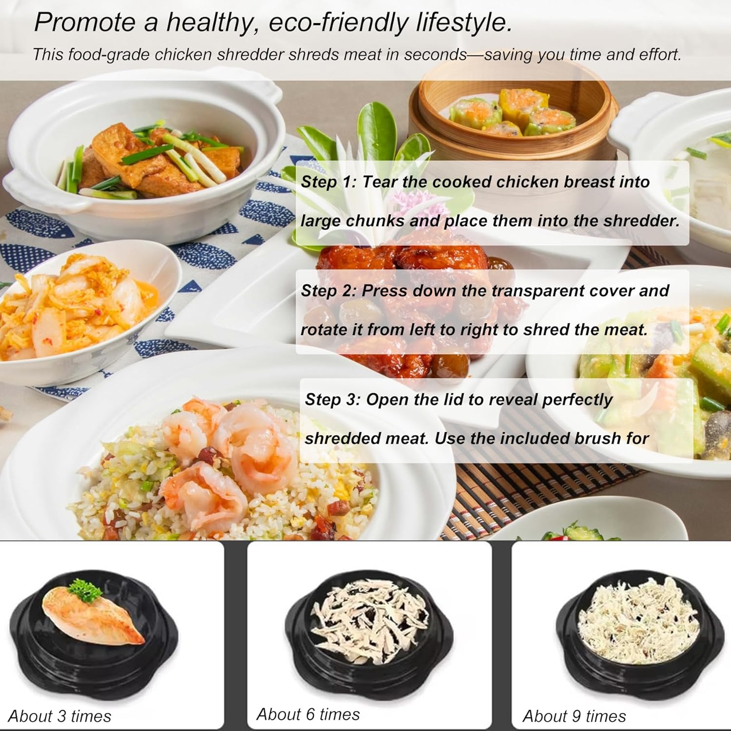 【Fast & Effortless Shredding】:Shred cooked chicken, beef, or pork in seconds with this upgraded chicken shredder tool twist. Built with full-coverage spikes, a 360° ergonomic handle, and a clear lid for visibility, this kitchen essential ensures consistent, mess-free results—perfect for any home and kitchen setup. Product size: 25x25x8.5cm, weight: 389g, color: transparent black. 【Stable, No-Slip Performance】:Unlike older models, this meat shredder tool twist features a reinforced anti-slip base with premium adhesive, keeping it firmly in place during heavy use. Whether you're prepping BBQ pulled pork or making a quick chicken breast shredder salad, this is one of the kitchen gadgets you’ll reach for every time. 【Sleek Look, Powerful Function】:With a transparent black lid and diamond-style detailing, this chicken shredder tool twist large looks as sharp as it performs. The floral-inspired design adds a touch of elegance to your kitchen accessories, making it a standout among modern kitchen appliances and a thoughtful addition to any wedding registry must haves list. 【All-in-One Convenience】:Whether you're meal prepping, grilling, or making weeknight dinners, this tool fits right into any routine. Designed for ease and efficiency, its lightweight, space-saving build makes it a go-to option in the world of kitchen must haves, delivering fast, uniform shredding for a wide range of dishes. 【Simple to Use, Built to Last】:Just load small pieces of cooked meat, twist, and watch it shred evenly through the clear lid. This durable meat shredder with five-pointed star spikes and a solid base is among the top kitchen tools for anyone who values speed, control, and ease in the kitchen.