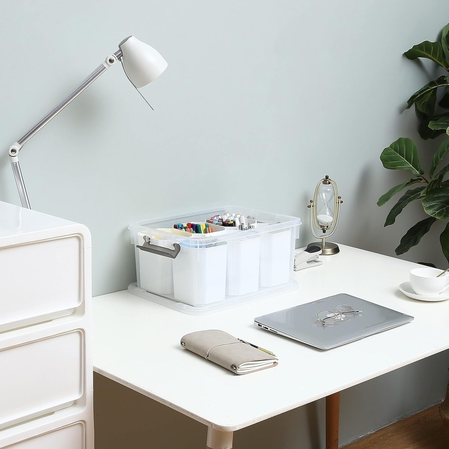 👍【Organization Made Easy】With the modular Citylife storage bins, taking a minimalist approach to storage can give you maximum flexibility. Perfect sort and storage screws, nuts, washers, craft, and crayons to help get your work area in order; 👍【6 Detachable Tall Inserts】These 6 inserts help separate a bin into multiple organized sections. This prevents the items from moving around and getting mixed up in a container. Can also be used in drawers and desktops; 👍【High Transparency】This clear design keeps the look neat and clean and lets you quickly identify the contents stored inside; 👍【Durable Construction】This box measurement is 15.94"L x 11.61"W x 7.28"H/17 quarts. Single insert measurement: 5.12"L x 4.72"W x 5.71"H/1.7 QT. Made of premium durable and thicker PP5 plastic so you don't have to worry about chipping. This can make it last a lifetime. odor-free, and BPA-free. Including 1 storage bin and 6 inserts.
