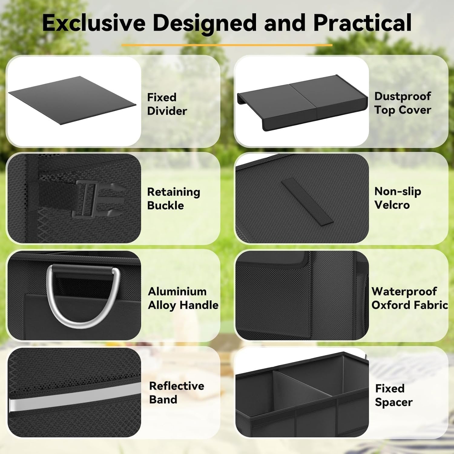 PREMIUM DURABLE CAR ORGANIZER - The trunk organizer for car is made from heavy-duty Oxford polyester with reinforced stitching and a sturdy aluminum handle for easy lifting. The trunk organizer is built to withstand daily wear while keeping your trunk clutter-free—no more flimsy organizers that collapse under weight! LARGE CAPACITY CARGO ORGANIZER - Features 2 main compartments, a shoe storage section, 2 mesh pockets, and 2 sealed pockets for smart organization, the truck bed organizer size is 22.4” x 13.2” x 11.6”. The car storage organizer is perfect for shoes, tools, camping gear, groceries, and more—finally, the suv trunk organizer is a solution for chaotic car trunks! SPACE-SAVING CAR STORAGE - When not in use, collapses the box flat into a slim carrying bag with secure clips. The car trunk organizer suv takes up minimal space, making it ideal for small trunks or storing in tight spots. NON-SLIP STORAGE TRUNK - Anti-slip strips on the bottom of the trunk storage organizer keep the organizer firmly in place, even during sharp turns or sudden stops—no more sliding around or spilled contents! WATERPROOF & EASY TO CLEAN - The leak-proof, wipeable Oxford fabric of the car trunk storage organizer lets you quickly clean with a damp cloth. The shoes organize of the car storage organizer trunk help you say goodbye to stains from muddy shoes or accidental leaks. MULTI-SCENARIO USE CAR CADDY - The trunk storage organizer is great for road trips, camping, picnics, and daily errands, Multi-Use for Cars, Travel & Home. The car organizer trunk can be used as a toy bin, tool caddy, or home storage box—versatile enough for any lifestyle!