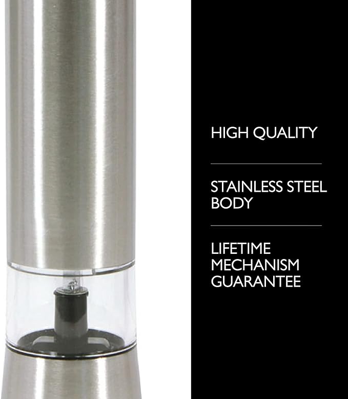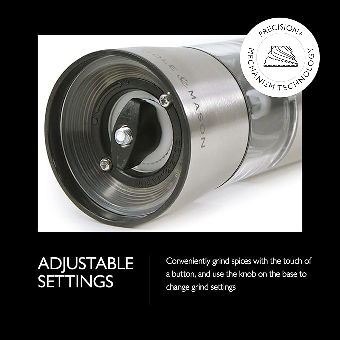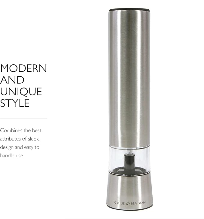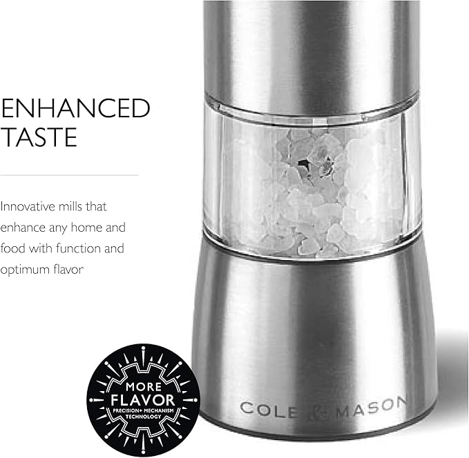 Cole & Mason Hampstead Electronic Salt Mill - Electric Salt Grinder Set - Adjustable Electric Spice Grinder - Kitchen Tool & Gadget - Hand Wash - Stainless Steel