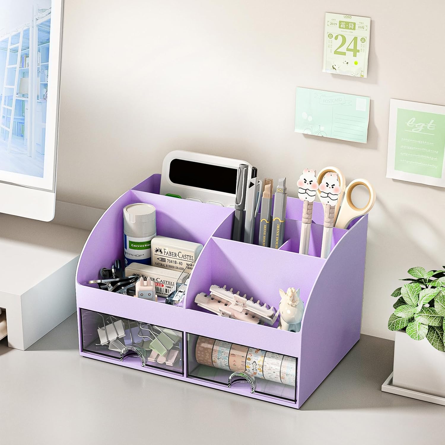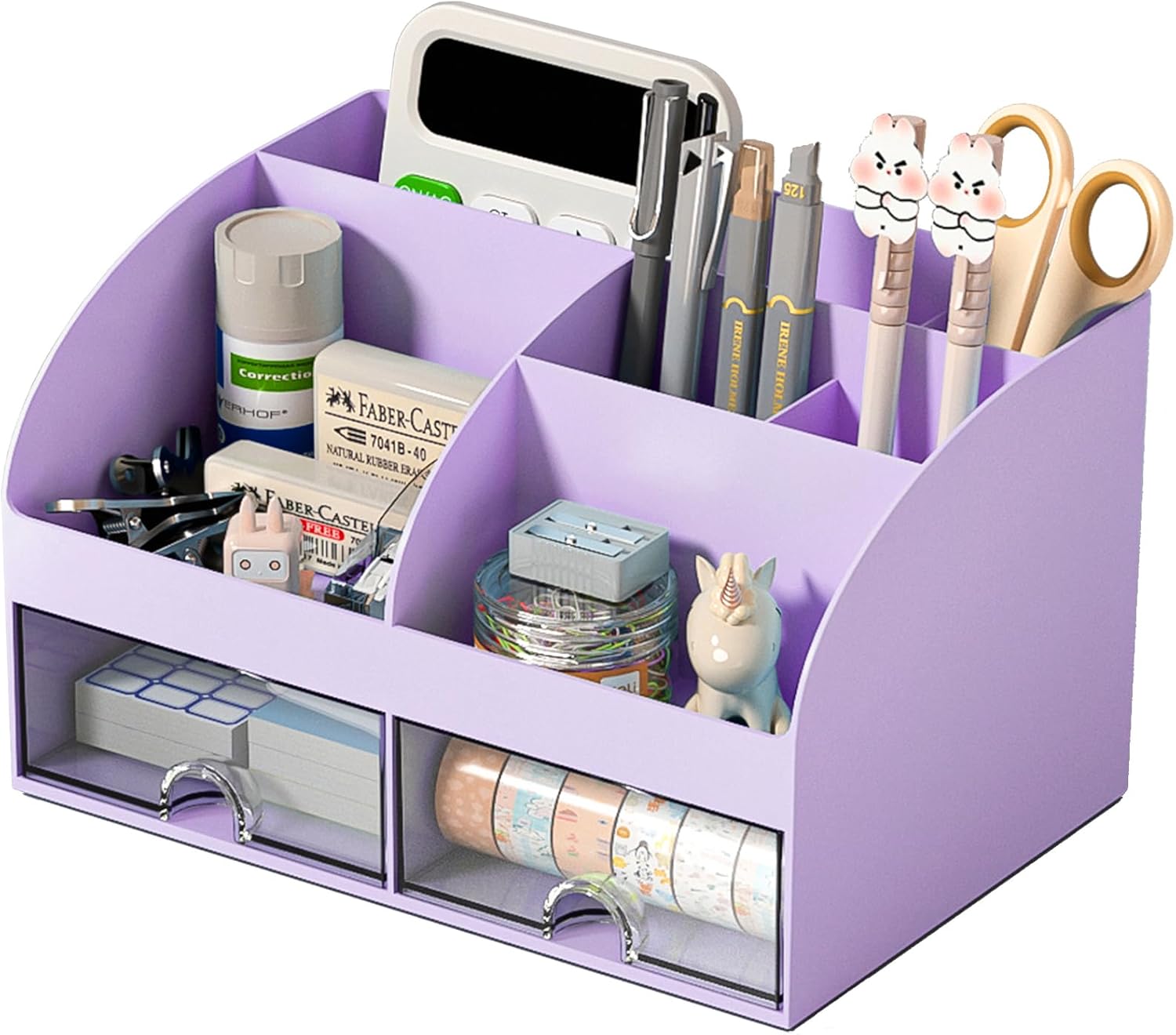 Premium Material: This plastic desk organizer is made of high quality environmentally friendly ABS material, non-toxic and tasteless, the material is tough and especially durable, smooth edges, safe to use for long term Multiple Storage Spaces: Small body with large capacity, great desktop assistant contains 6 Sections and 2 drawers, different compartments allow you to place items according to your needs, transparent drawers allow you to quickly find what you need, easy to place and take Applicable Occasions: It can organize your dresser lotion, makeup brushes, lipstick, nail polish, cosmetics. Also great for organizing your desk stationery such as calculators, notepads, paper clips, pencils, scissors, flipcharts, business cards, notes and other small items Perfect Size for Desk: Perfectly sized, it serves as a living room or bedroom desktop organization for daily items, placing it doesn't take up much of the desktop surface, this organizer provides enough space to store your items for easy use and can keep your desk or dresser clean and organized Assured Shopping Experience: The elegant purple desktop decorations organiser makes your office/ home/ school/ college dormitory desktop look more classy, it's the best choice for your own use or gift. If you have any questions, please contact us, we will be happy to serve you