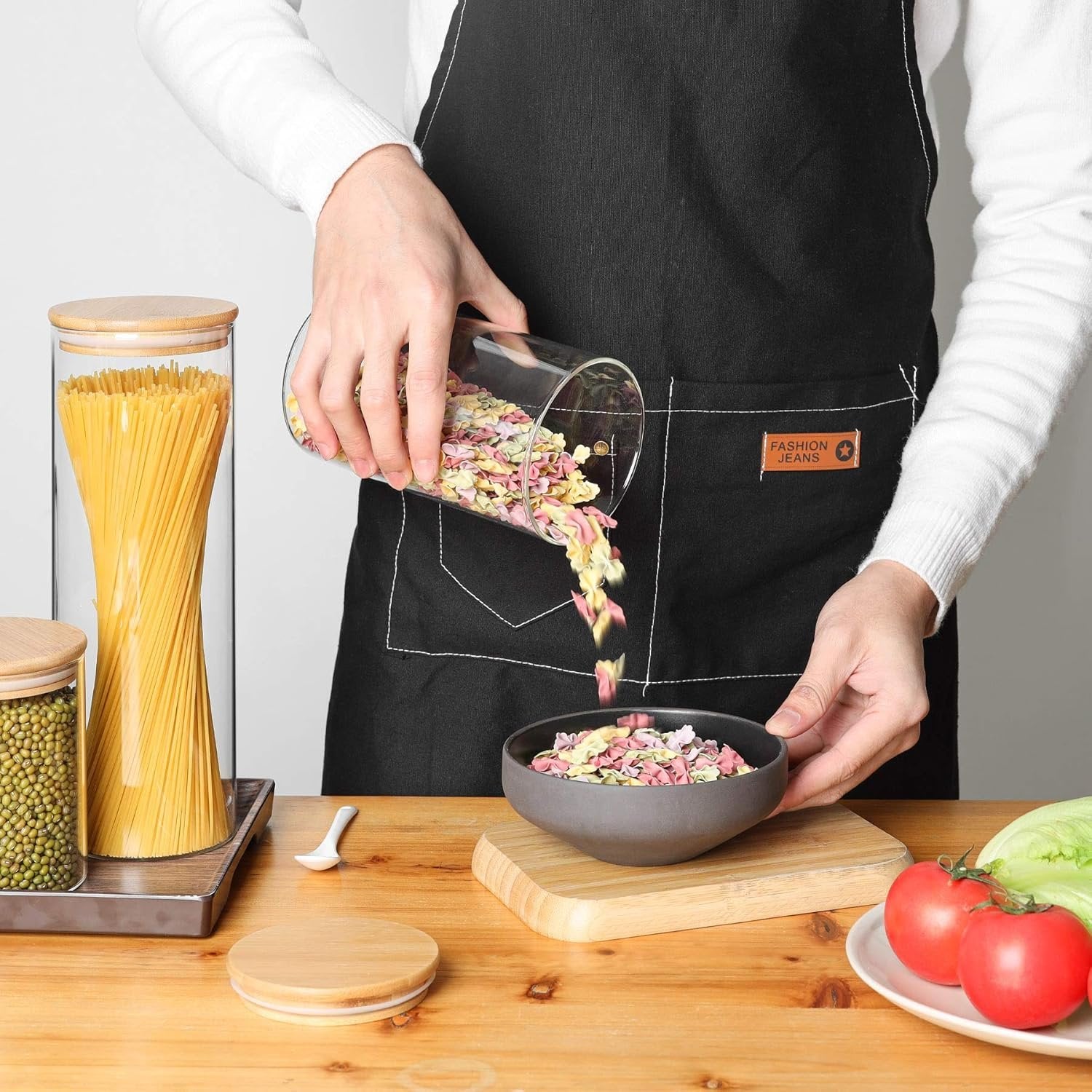 [Safe to Use] The airtight canisters set is made of food-grade high borosilicate glass, lead-free, non-toxic. The sealing loop of the top is made of harmless silicone material. [Tall and Large for Food Storage] The 11†tall food storage jar with upgraded wider width 4" is big enough to store spaghetti, pasta, noodles, flour, cereal, tea, coffee, beans, rice etc. Store goodies for foodies and keep your kitchen organized. [Airtight Storage Jar] Each Spaghetti jar is well sealed with all-round silicone sealing loop around the wood cover, creating a moistureproof environment to keep your dry food inside clean and fresh. [Just a Glance at What’s Inside] Thanks to the clear high borosilicate glass, you’ll always know how much is left and how the preserved food is progressing without removing the lid. Plus, the sleek see-thru design makes it look more visually appealing on your kitchen cabinet. [3 Same Size Storage Jar] 3 jar of 1 size: 74oz. 4†x 4†x 11â€(L x W x H). Big and Tall enough to store your food in your kitchen or pantry. The glass jars is safe in dishwasher while the wood lid is hand washing only!