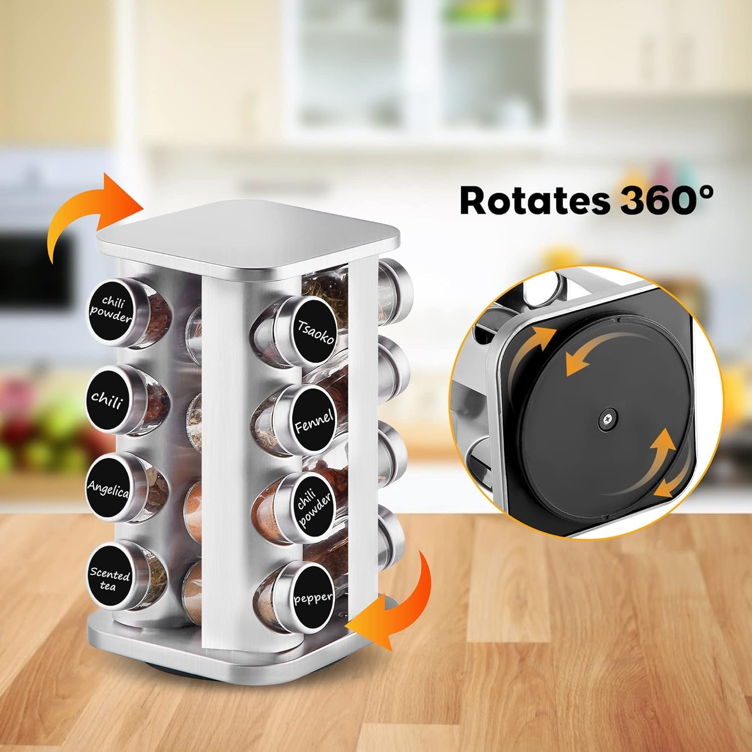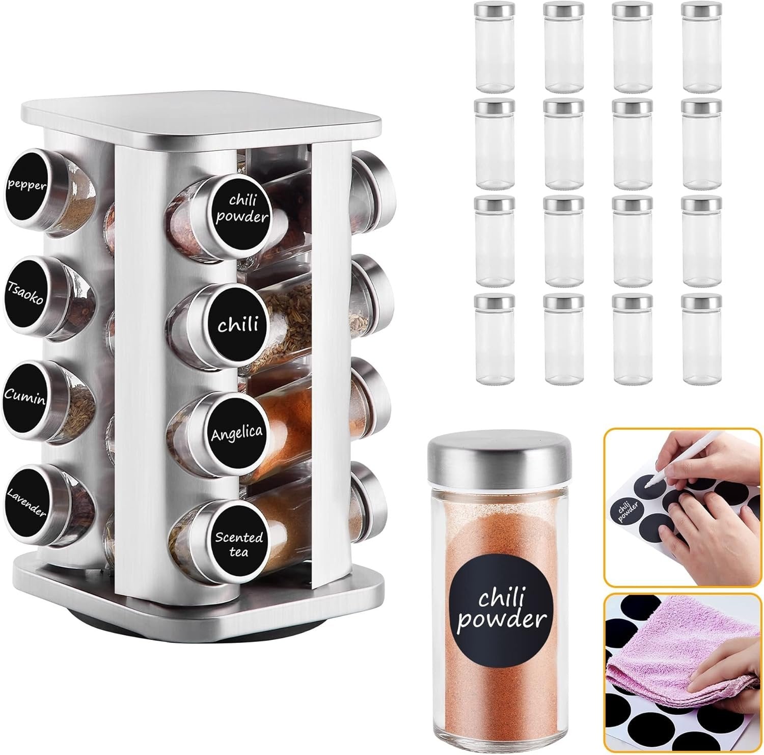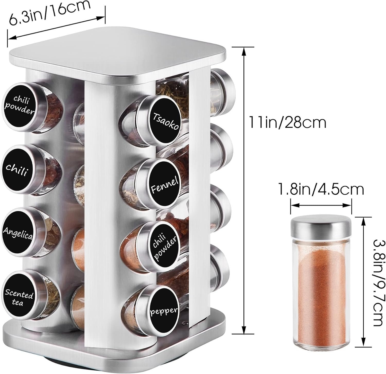 Countertop Revolving Spice Rack, 16-Jars Stainless Steel Spice Rack Organizer, Square Carousel Spice Rack Tower, Seasoning Storage Organization for Kitchen Home Dried Herbs
