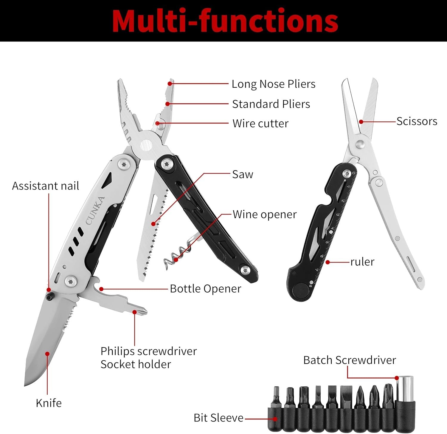 【Heavy-Duty Sprung Pliers Multi-tool with Detachable Scissors】CUNKA Pliers Multitools packs the spring action needle nose and standard pliers, full-sized scissors, pocket knife blade, serrated knife, saw, wire cutter, Philips and slotted screwdrivers, hex wrenches, survival whistle, flint rod, bottle opener in one cassis. It comes with a bit set and robust nylon pouch for everyday carry. 【Rust Proof Premium Materials for the Body and Tools】CUNKA multi-function Pliers are made from stainless steel, which offers you years of service life. With elegant black oxidation on the surface and the ergonomic design, it allows you to have a comfortable and firm grip on it. It’s rust proof, corrosion resistant, strong, durable, reliable and easy to handle. 【Outside Accessible and Self-Locking for Safety】Folding the handles of the spring-loaded pliers out open, the gadgets are on the outsides of the handles for easy access. These outboard tools, including the scissors, could open right up and lock safely in place for heavy use. The spring assistance scissors could also be easily separated from the pliers as a normal multifunctional shears. 【Lightweight EDC Multi Tools and Pocketable for the Commute】Designed essentially for everyday carry, with the closed size of 4.2 inches in length & 1.8 inches in width and a total weight of 0.68 lb, this multi tool is ideal for wilderness trips, on-site jobs, fieldwork, DIY works, construction and maintenance professions. Simply put it on the belt or throw in a backpack or a work bag, it’s a pretty good companion to tackle daily tasks. 【Suitable for DIY and Outdoor Lovers】Very useful for outdoor survival, camping, fishing, hunting, hiking, gardening, car care, basic repairs, household and home improvement tasks. It is a must have for outdoor enthusiasts and DIY handymen and perfect gifts for men on occasions like Christmas, Father’s Day, Valentine’s Day, birthday or anniversary.