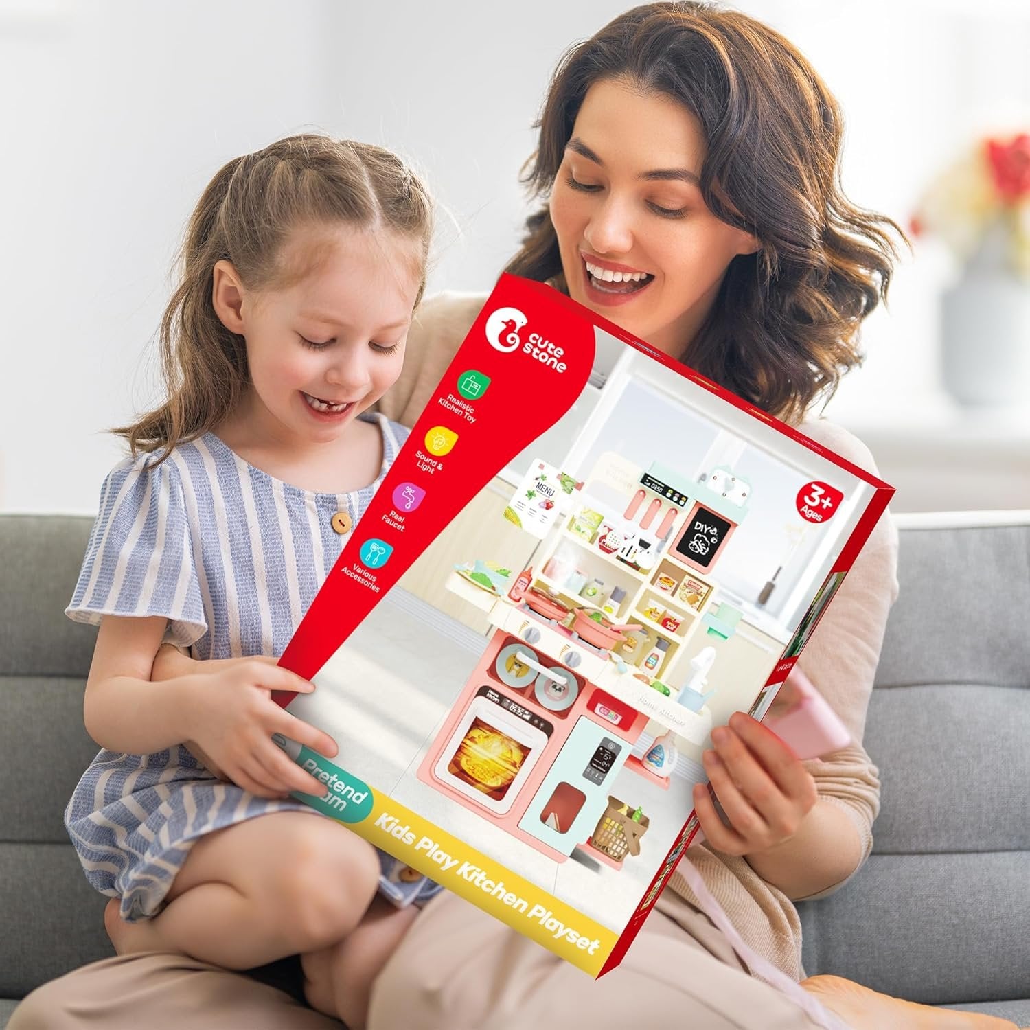 CUTE STONE Pretend Play Kitchen, Water Sink, Stove with Steam&Light&Sound, 63PCS Toy Kitchen Accessories with Toy Food, Pots, Utensils, Kids Kitchen Play Set, Ideal Gift for Boys Girls Toddlers(Pink)