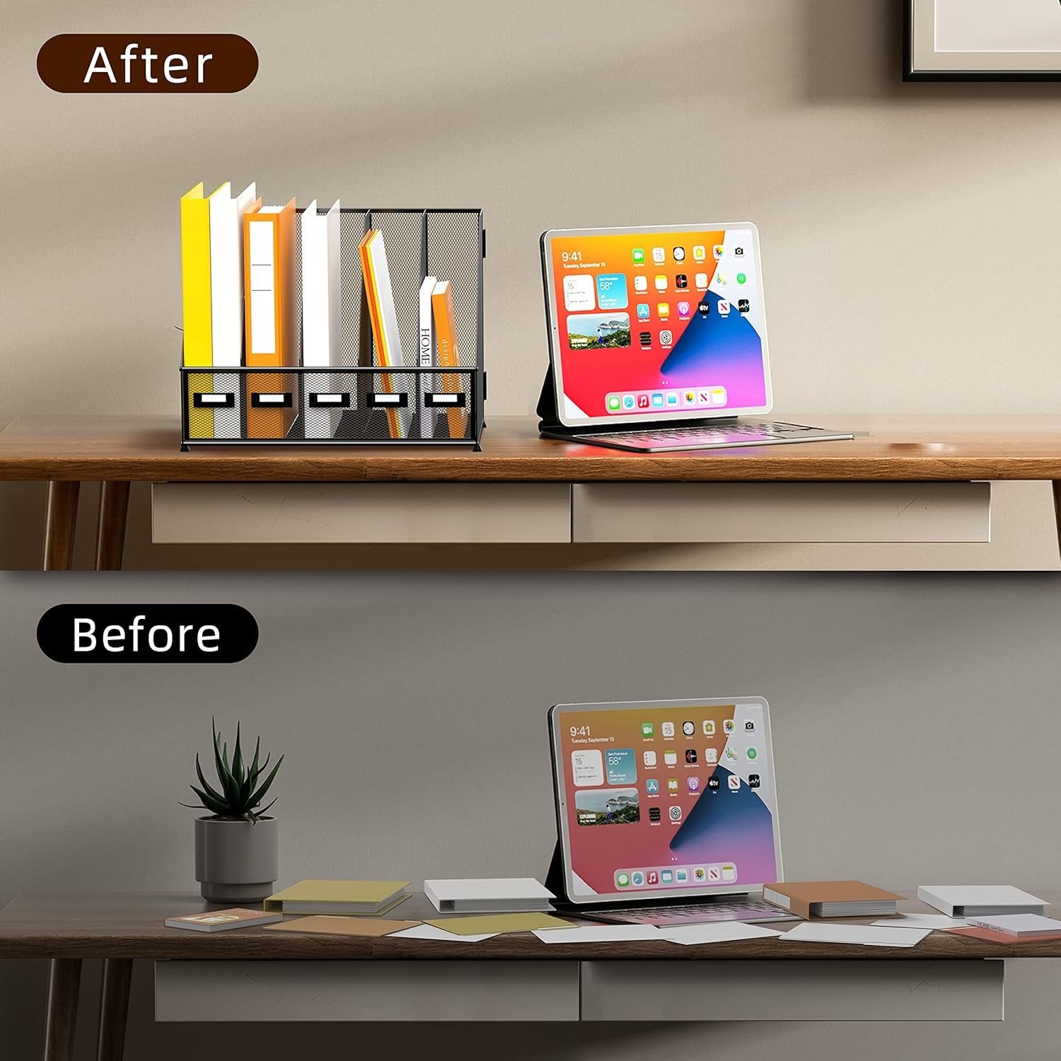 [Multiple Use] This desk tray is perfect for magazines, letter, A4 paper, stationary, file. Almost all your documents will fit in our magazine organizer. Whether you are in the office, home or school, this metal desk holder can meet your storage needs. [Large Capacity] This magazine holder has five compartments, each 3.35 inches wide. The huge capacity allows you to save your space and keep your desk tidy. [Durable & Sturdy] This book bin for classroom is made of metal and has a durable mesh surface. It not only ensures the firmness of the storage rack, but also prevents dust. [Lable Design] This metal magazine holder is designed with five labels. You can classify your various documents according to the labels, and put similar documents in the same label. In this way, you can find the documents you are looking for as quickly as possible, saving your time greatly. [Perfect Size] Our magazine file holder is 16.14"L x 9.84"W x 12.6"H. This desk organizer takes up a small area of the table, but it can bring you huge storage space.