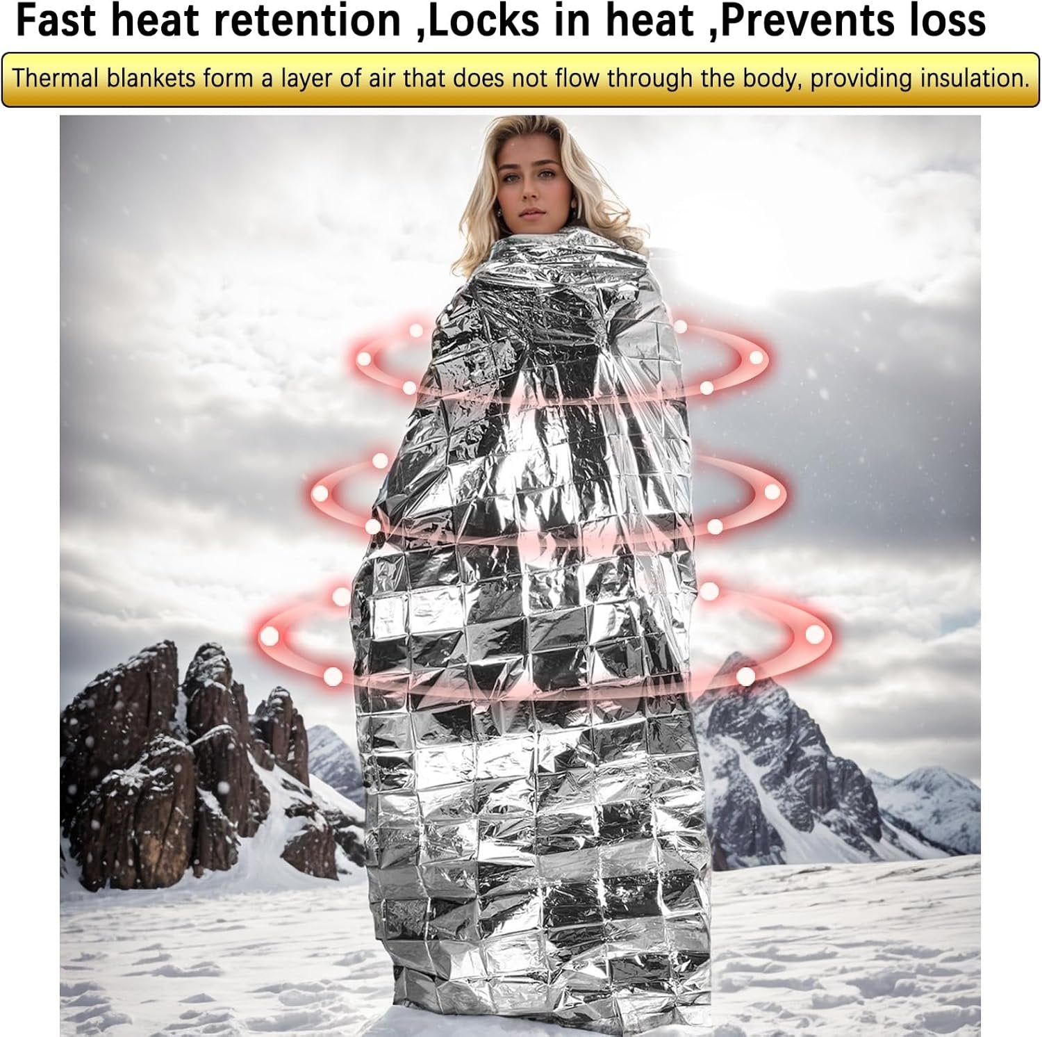 【Heat-Locking Technology】: Our emergency poncho locks in 90% of your body heat, ensuring warmth in unexpected conditions. 【Versatility at Its Best】: This multi-use blanket can be used as a sun and heat shield in summer, a raincoat during rain, a waterproof mat when spread on the ground, a makeshift tent, an outdoor sleeping bag at night, a shoe cover for wet shoes, a lifesaving bandage, and even as a water storage container. 【Compact and Reusable】: These lightweight camping blankets don’t occupy much space making it easy to store in your car or bag. It's designed for multiple uses, proving to be a big help in emergencies. 【Dual-Side Usage】: Our camping emergency blankets have a reflective side, enhancing visibility in low light conditions. 【Comprehensive Set】: Each set contains 4 emergency ponchos (49.2 inches x 39.3 inches) and 2 emergency blankets (82 inches x 51 inches).