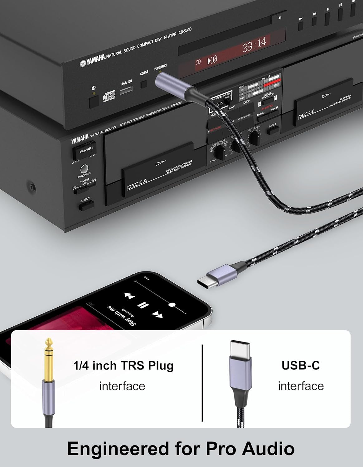 🎵Plug and Play: The DCNETWORK USB-C to 1/4 stereo cable connects your mobile phone, iPod, laptop or other device with a USB-C jack to guitars, mixing consoles, home theatre equipment and amplifiers with a 6.35mm jack 🎵Amazing sound quality: Shielded USB-C to 1/4 cable features 24K gold-plated, corrosion-resistant connectors and double shielding for optimal signal transfer, delivering clear, crisp audio and a lossless, noise-free hi-fi audio experience. 🎵Upgraded Durability: Alloy shell and double nylon braid prevent the cable from being pulled by sharp edges in harsh installation environments, preventing scratching 🎵Lossless Audio Transmission: Pure copper core provides maximum conductivity and durability, this USB C to 1/8 cable transmits high-purity audio signals with minimal loss, bringing you a different listening experience 🎵Wide compatibility: This USB-C to 6.35 mm jack plug fits all devices with a 6.35 mm jack and is compatible with Yamaha keyboards, Casio keyboards, Roland keyboards, electronic keyboards, digital pianos, home theatres, speakers, bass amplifiers, recorders, mixers, guitars and more.