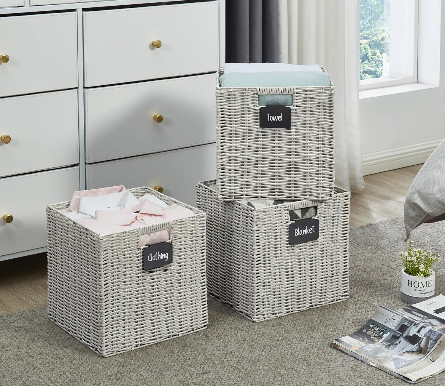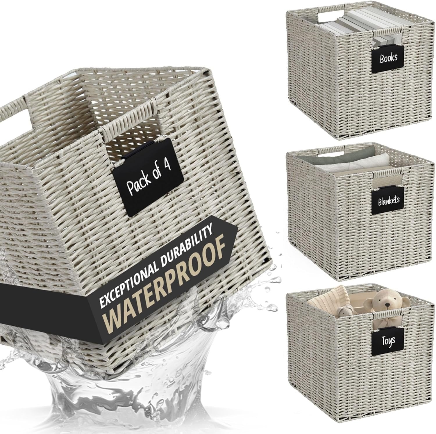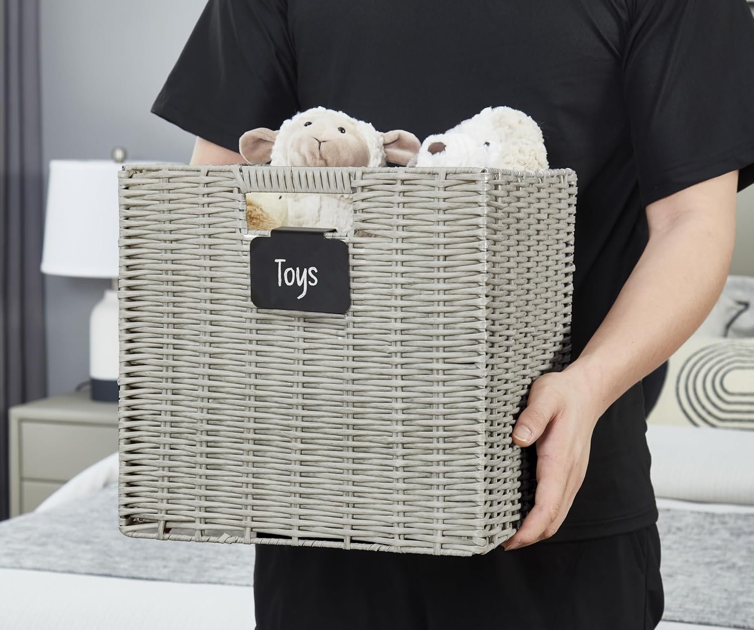 Plastic Wicker Baskets: DECOMOMO Cube Storage Baskets are made with woven plastic and supported by a metal frame. Plastic storage cubes come with complimentary blackboard labels and white marker with erasable ink making them reusable. Multi-Purpose: DECOMOMO's wicker storage baskets provide a solution to many storage needs; perfect for organizing nursery products, office supplies, clothes & linen, books in shelves, bedroom, living room, kids’ room, office, and more! DECOMOMO Storage Cubes - Set of 4. Dimensions (each): 12” (L) x 12” (W) x 12” (H) / (30.5 cm x 30.5 cm x 30.5 cm). DECOMOMO wicker baskets storage organization bins have perfect size for IKEA Kallax, Better Home, and Garden Shelving Unit (12-inch), ClosetMaid 1305, 8985, 8987. Care Tip: Our 12x12x12 cube basket is made with water-resistant plastic material and can easily be cleaned directly with water or damp cloth. If you run into any issue, please feel free to get in touch with us via Amazon. Foldable Design: Our storage baskets for shelves have a convenient foldable design which makes them easy to store when not in use. Simply push the base of the plastic bin inward from the bottom to fold it. Trusted Brand: Since 2017, DECOMOMO has been dedicated to superior storage solutions. We prioritize 100% customer satisfaction, backed by a money-back guarantee. Need assistance? Contact us on Amazon for a response within 24 hours.