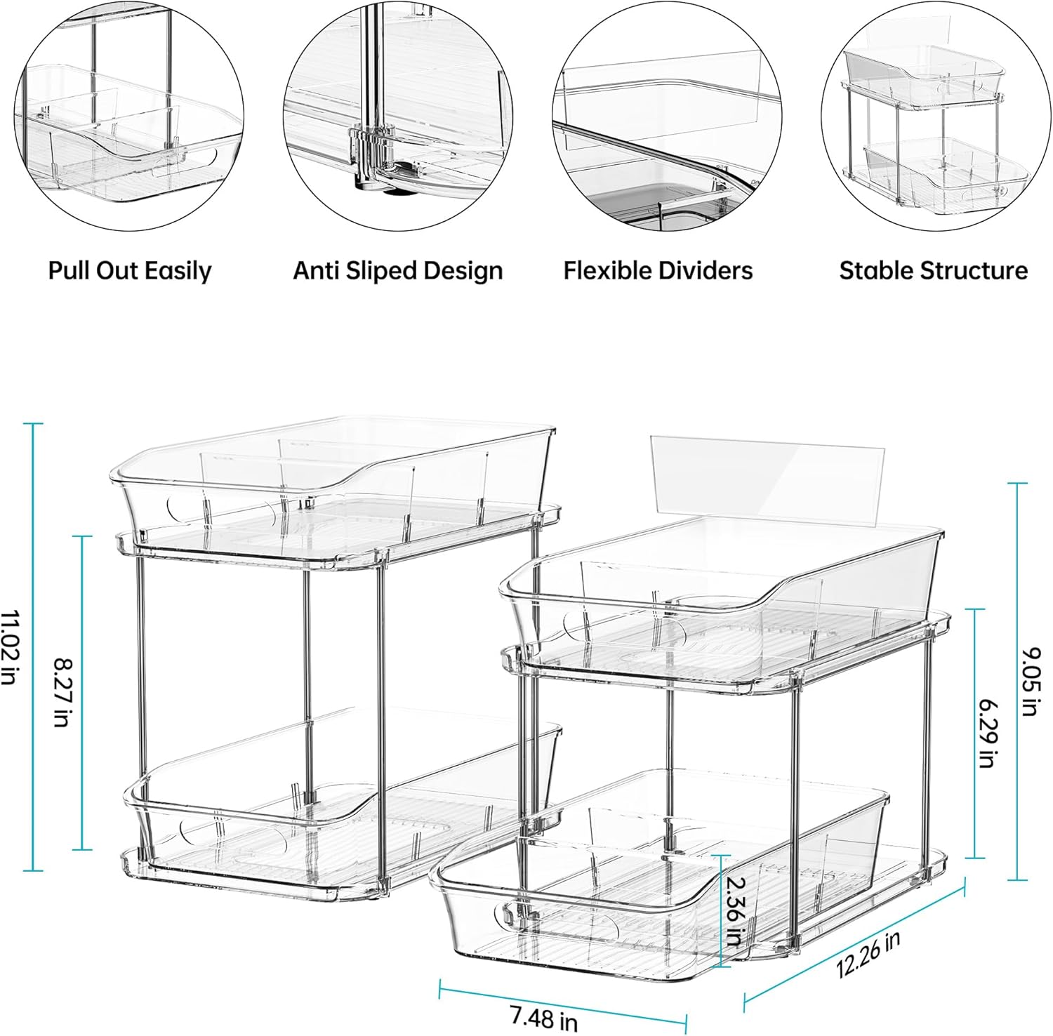 Delamu 2 Sets of 2-Tier Clear Under Sink Organizers and Storage, Multi-Purpose Stackable Bathroom Cabinet organizers, Pull Out Kitchen Pantry Organization and Storage with Dividers