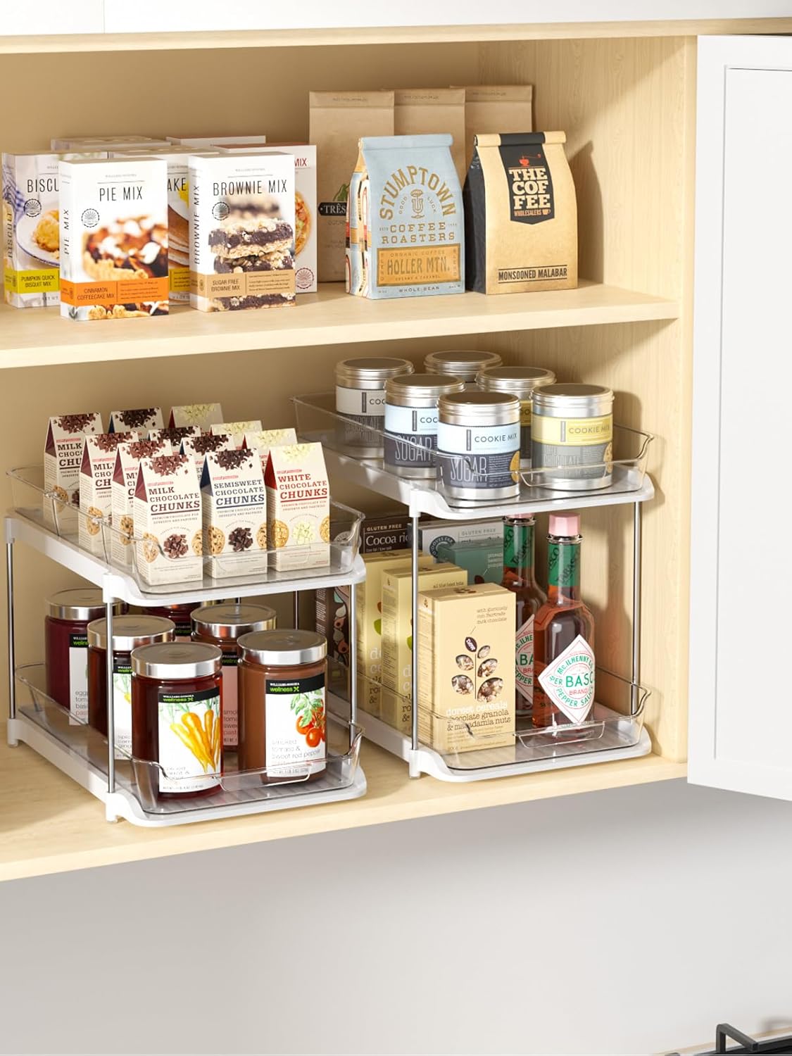 • Upgraded Clear Acrylic Organizers: The kitchen cabinet organizer are Selected with high-end acrylic, aluminum alloy support rod, etc high-quality materials to Produce, so you can see the inside clearly and find the wanted stuff fast, An essential assistant for bathroom organization, and kitchen organizer and pantry storage, keeping toiletries and kitchen seasoning organized.