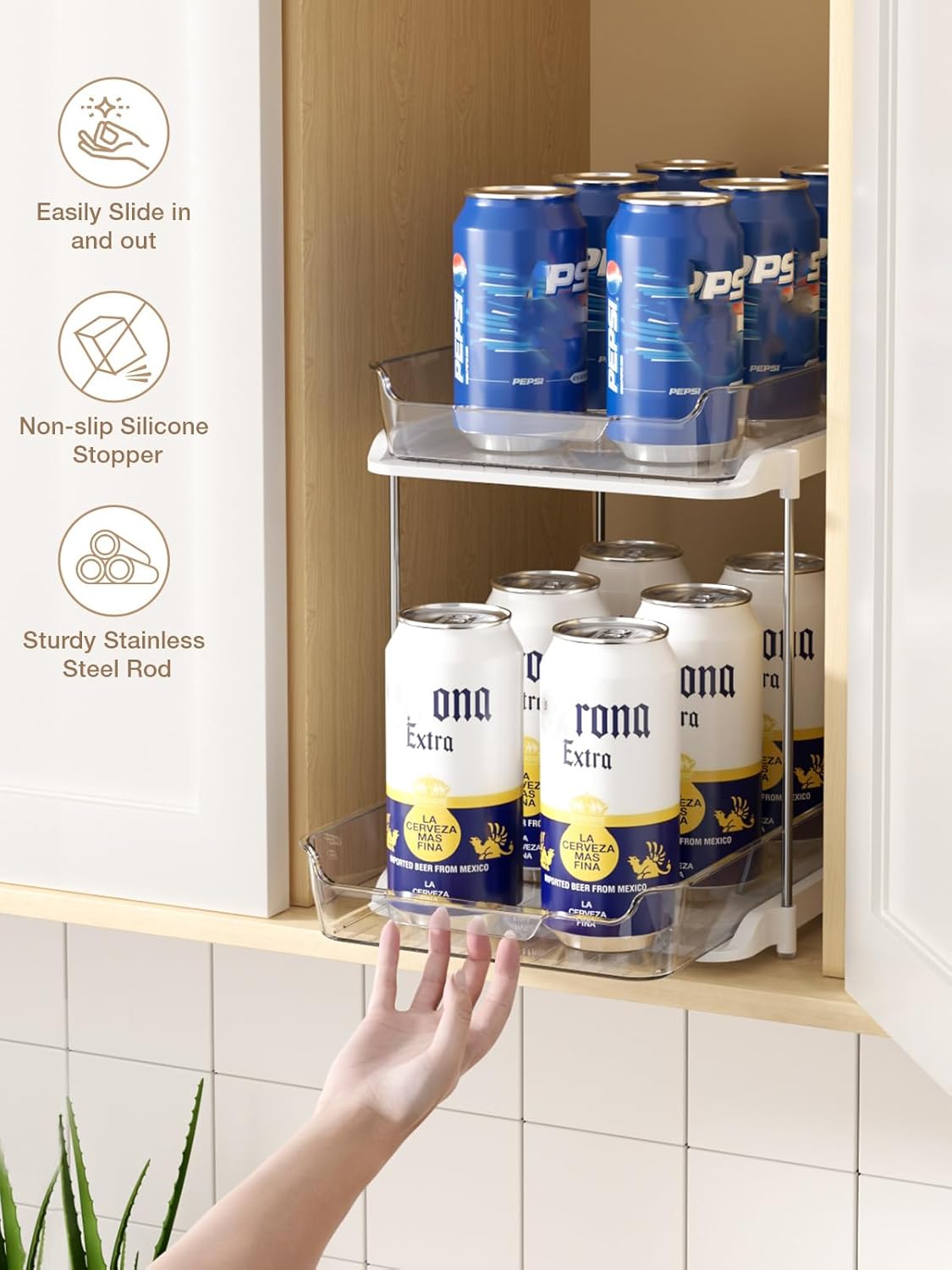 • Stackable Pantry Storage Organizer: What sets this pull out cabinet organizer apart is that you can stack 3 at a time according to space needs, which means it is a must-have space saver! it is very useful for organizing to hold spice jars, medicines bottles, beverages, canned goods, grab-and-go snacks, and even a variety of health/beauty aides, and small items.