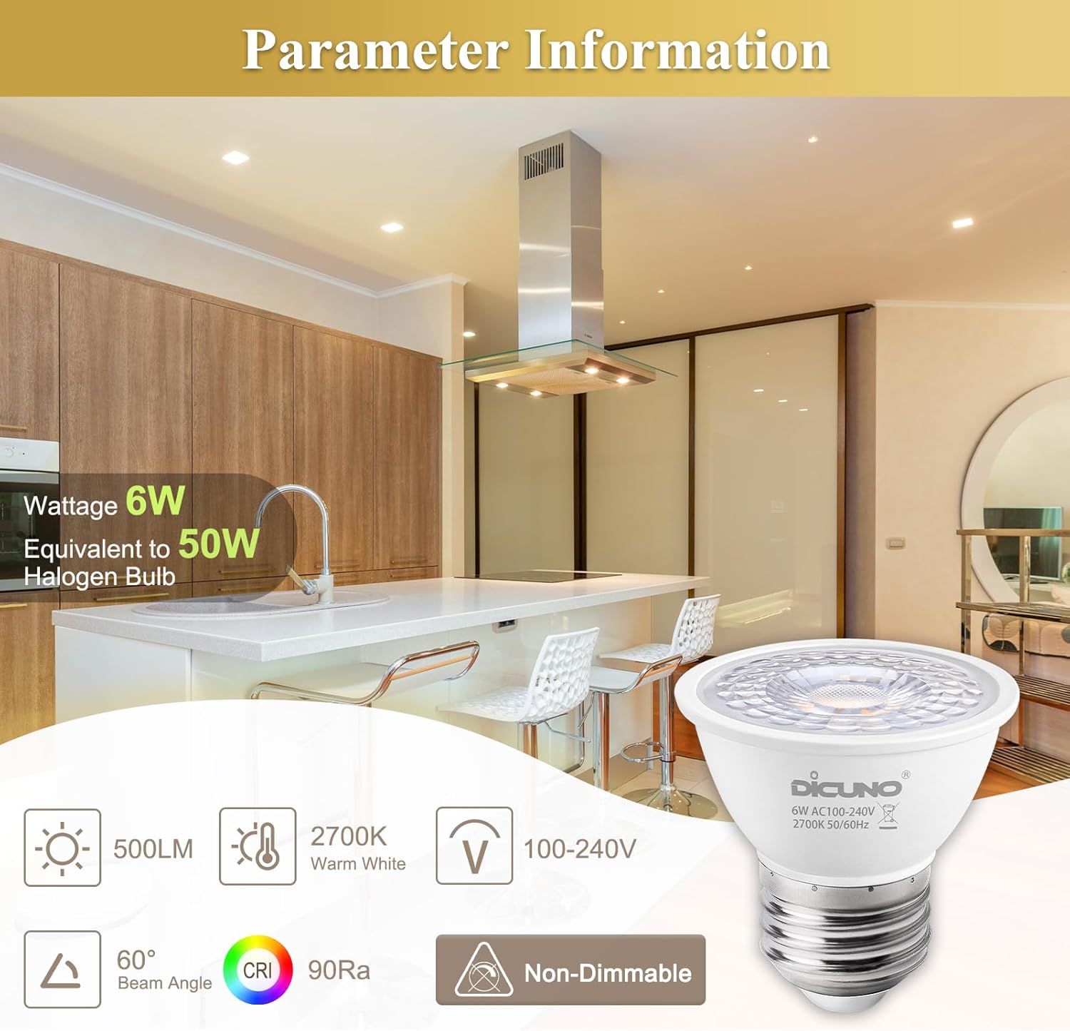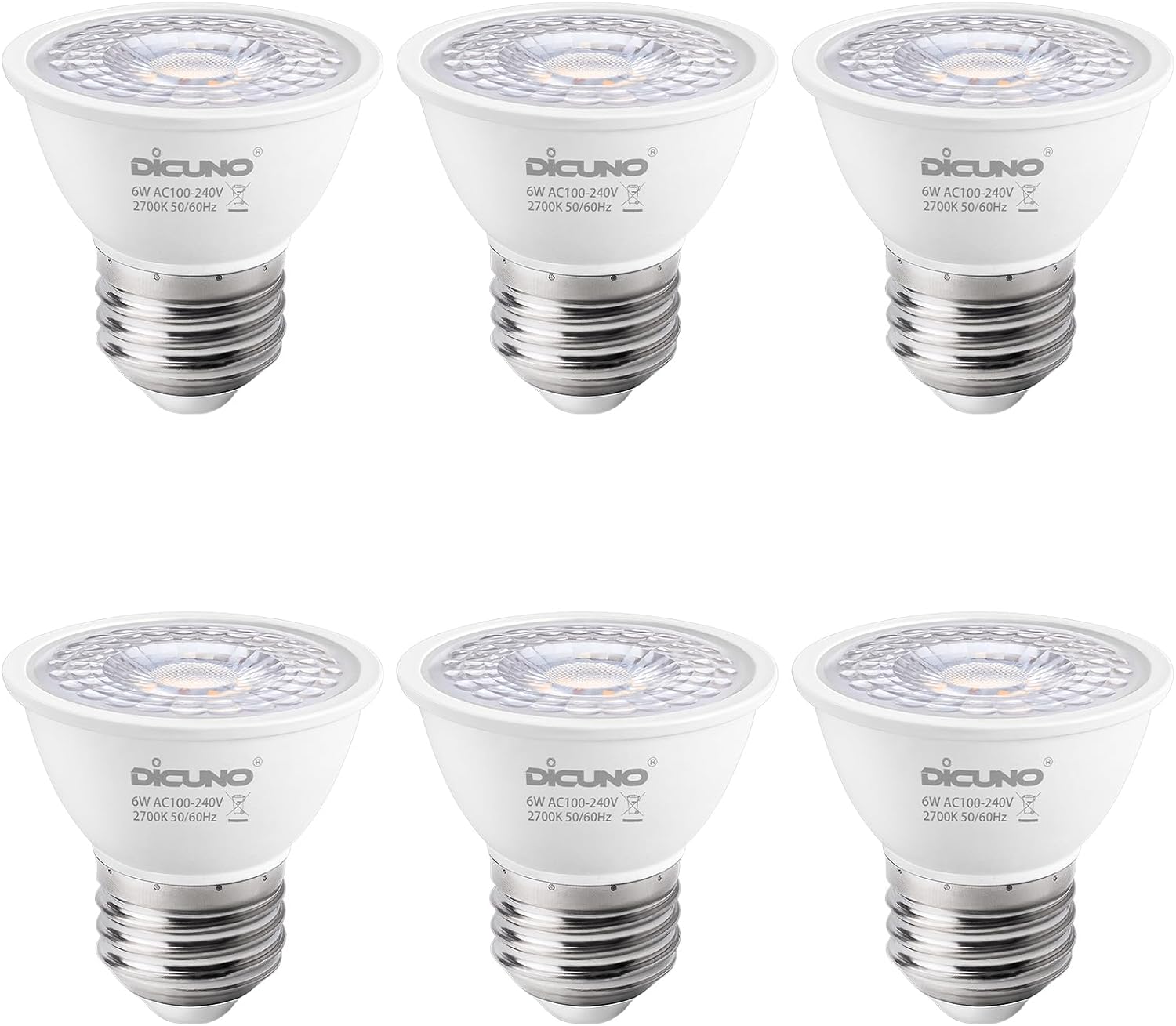 Short Neck Profile: DiCUNO PAR16 E27 LED bulb uses an E27 medium screw base and has a short neck body, making it a perfect fit for ceiling pot lights. With a 60-degree beam angle, the PAR16 spotlight is ideal for track, recessed or accent lighting in recessed can lights, track lights, ceiling lights, spotlight fixtures, range hood lights, and more. Energy-saving 50W Replacement: DiCUNO 6W PAR16 light bulb replaces 50W PAR16 halogen bulb while using up to 88% less energy. It produces a high brightness of 500 lumens without sacrificing light quality. Lead & mercury free. No UV output or IR radiation. 90 CRI- Excellent Color Quality: Designed for eye protection, DiCUNO PAR16 E27 LED bulb 2700K has a high CRI of 90, close to natural light. The 2700K PAR16 bulb brings you true and natural color, can improve visual clarity, and reduce eye strain. Enhance your interior design and create the perfect ambience for your home with DiCUNO high CRI PAR16 pot lights. Warranty: DiCUNO offers a 3-month refund and 1-year warranty; if you have any questions/problems about the PAR16 led bulbs or other services, please feel free to contact us, and we will try our best to answer your question and solve your problem.