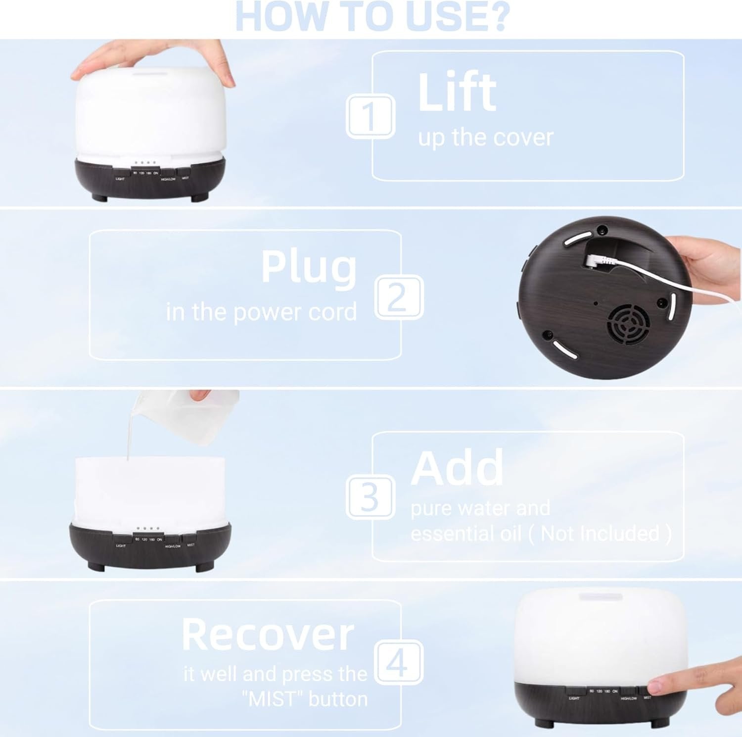 【Widely Used Humidifier & Easy to Clean】The air diffuser small humidifier has a wide range of uses, not only as a diffuser for essential oils and a personal humidifiers, but also as a small night light and a smart humidifier for plants. The small diffuser for essential oils easy to clean,it equipped with a white dust cover, you can take out the cover directly and to clean inside of the diffuser,Very convenient! In The Packge :Ultrasonic Humidifier*1, Remote Control*1, Adapter*1, User manual*1, Measuring cup*1.