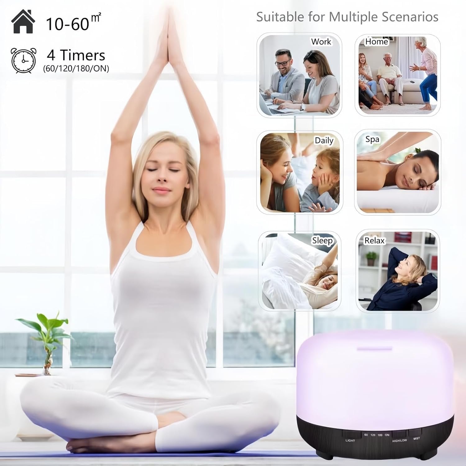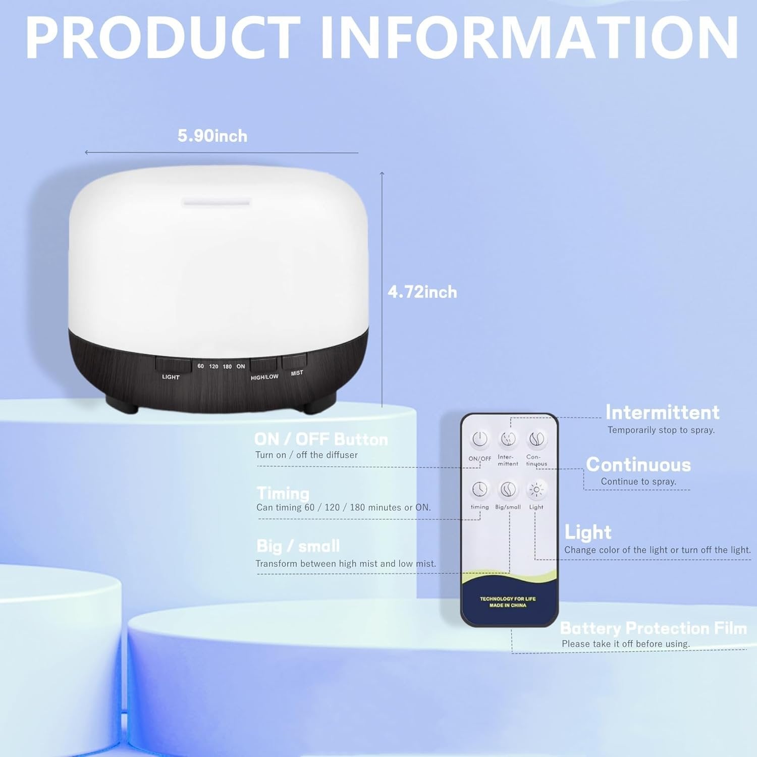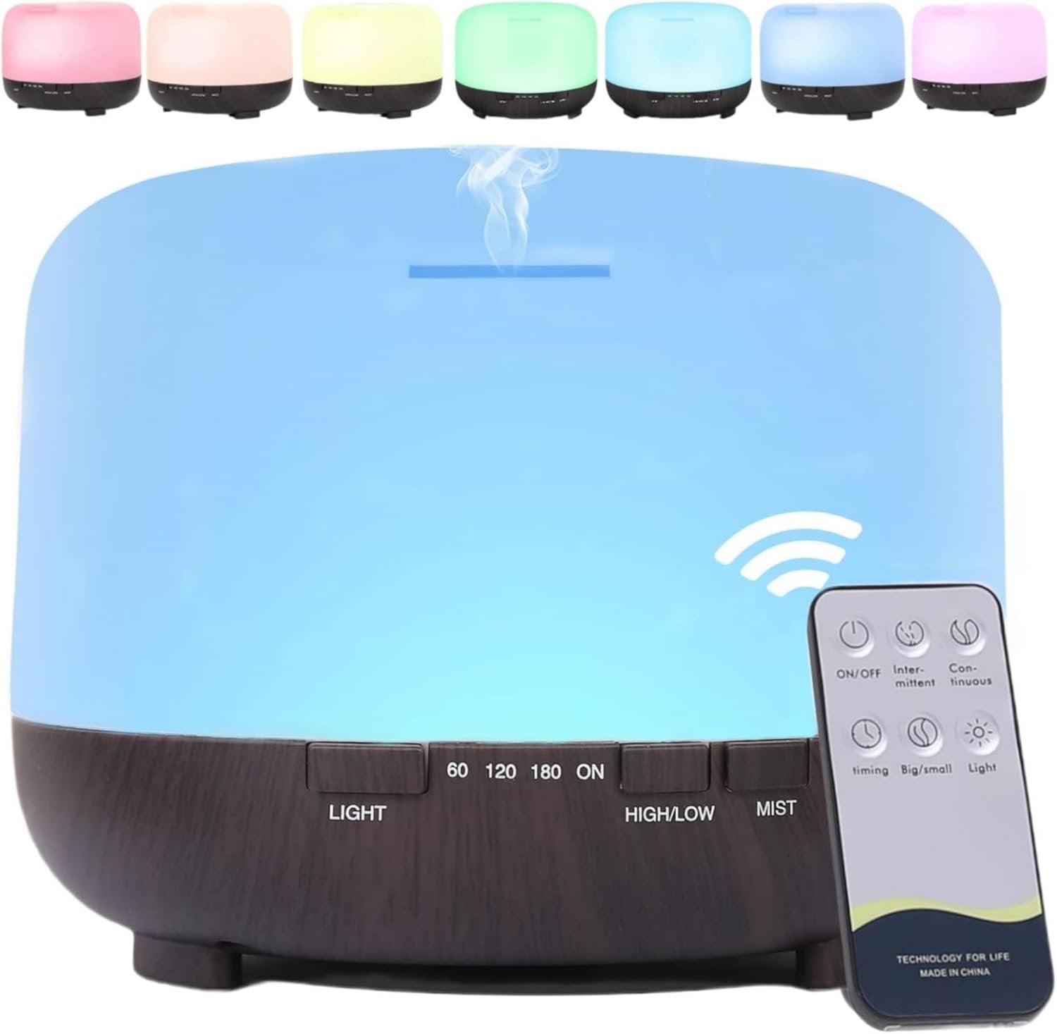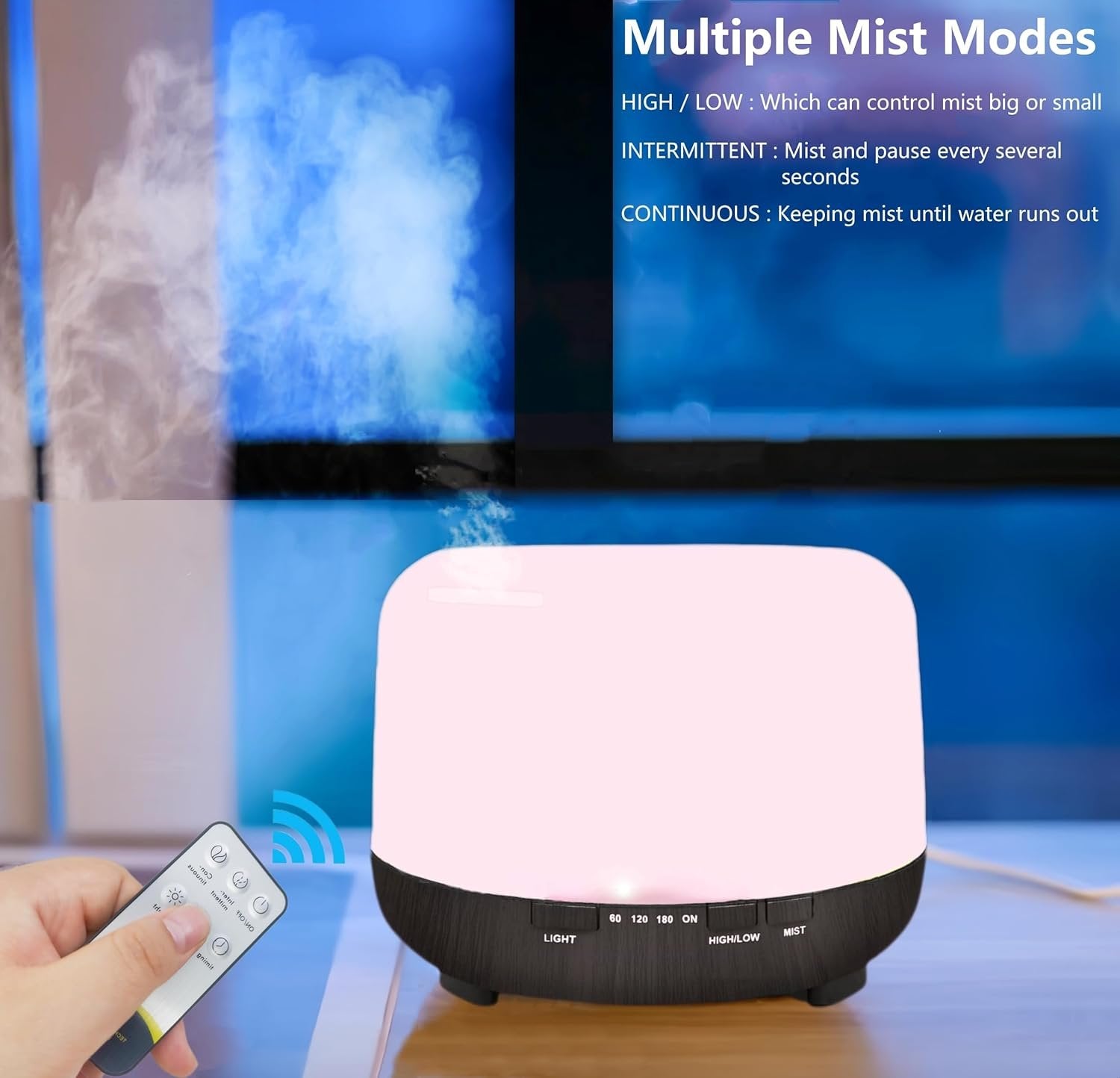 【Remote Control Humidifier & Two Mist Modes】The essential oil diffuser for large room with wireless remote control,you can easily to control it on/off, lights color, mist mode(HIGH/LOW), time setting (60Min/120Min/180Min/Steady On) by the remote control, much convenient to operate in a distance. Press the "HIGH/LOW" button to change the mist mode for strong or weak steam. This light diffuser is perfect to put for baby room, bedroom, bathroom or as a desk humidifier for office